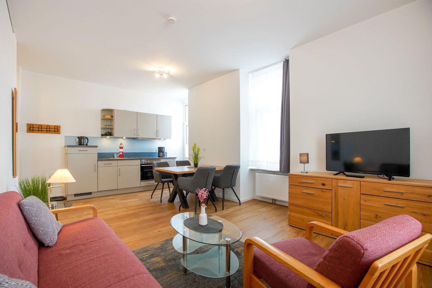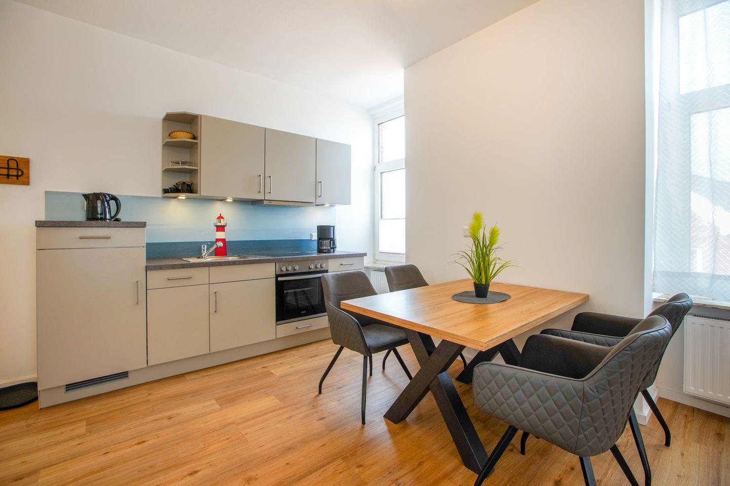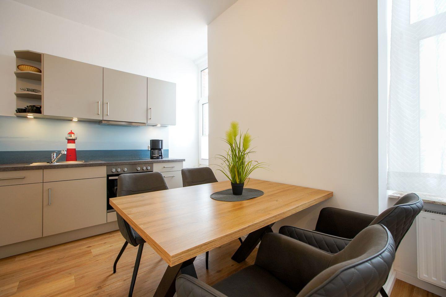 Der Wohnbereich mit integrierter Küche bietet Platz für gemeinsame Mahlzeiten und ruhige Abende. Eine Spülmaschine gehört zur Ausstattung, WLAN steht zur Verfügung. Durch die Lage im oberen Geschoss ergibt sich ein Blick über die Dächer von Borkum.