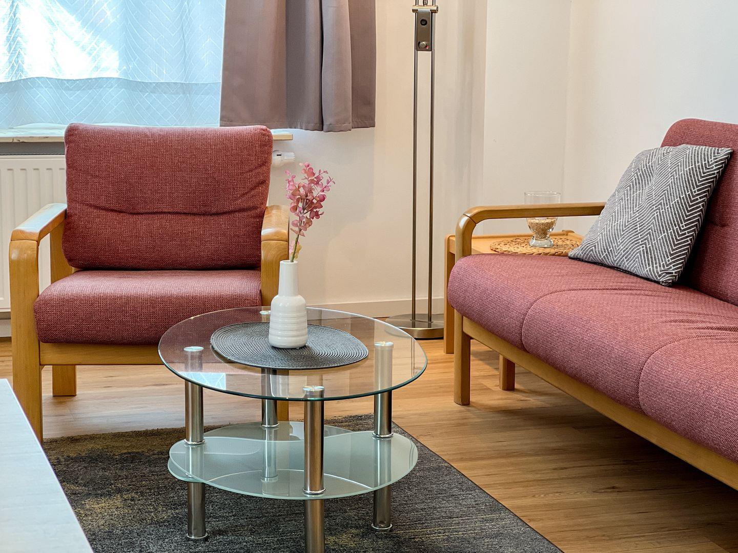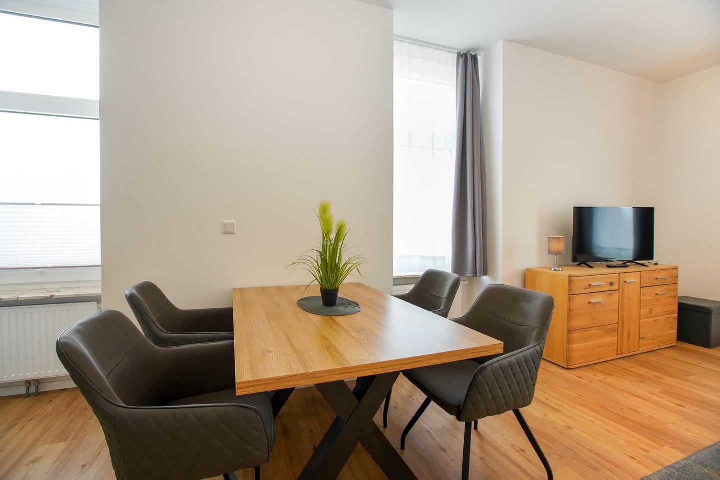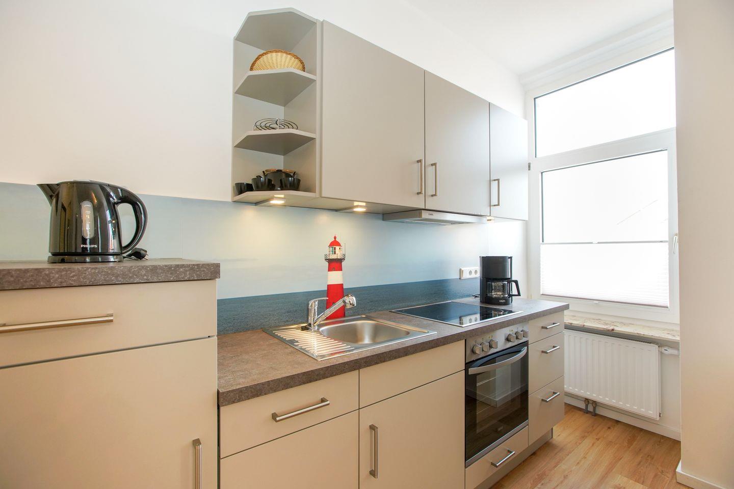 Der Wohnbereich mit integrierter Küche bietet Platz für gemeinsame Mahlzeiten und ruhige Abende. Eine Spülmaschine gehört zur Ausstattung, WLAN steht zur Verfügung. Durch die Lage im oberen Geschoss ergibt sich ein Blick über die Dächer von Borkum.