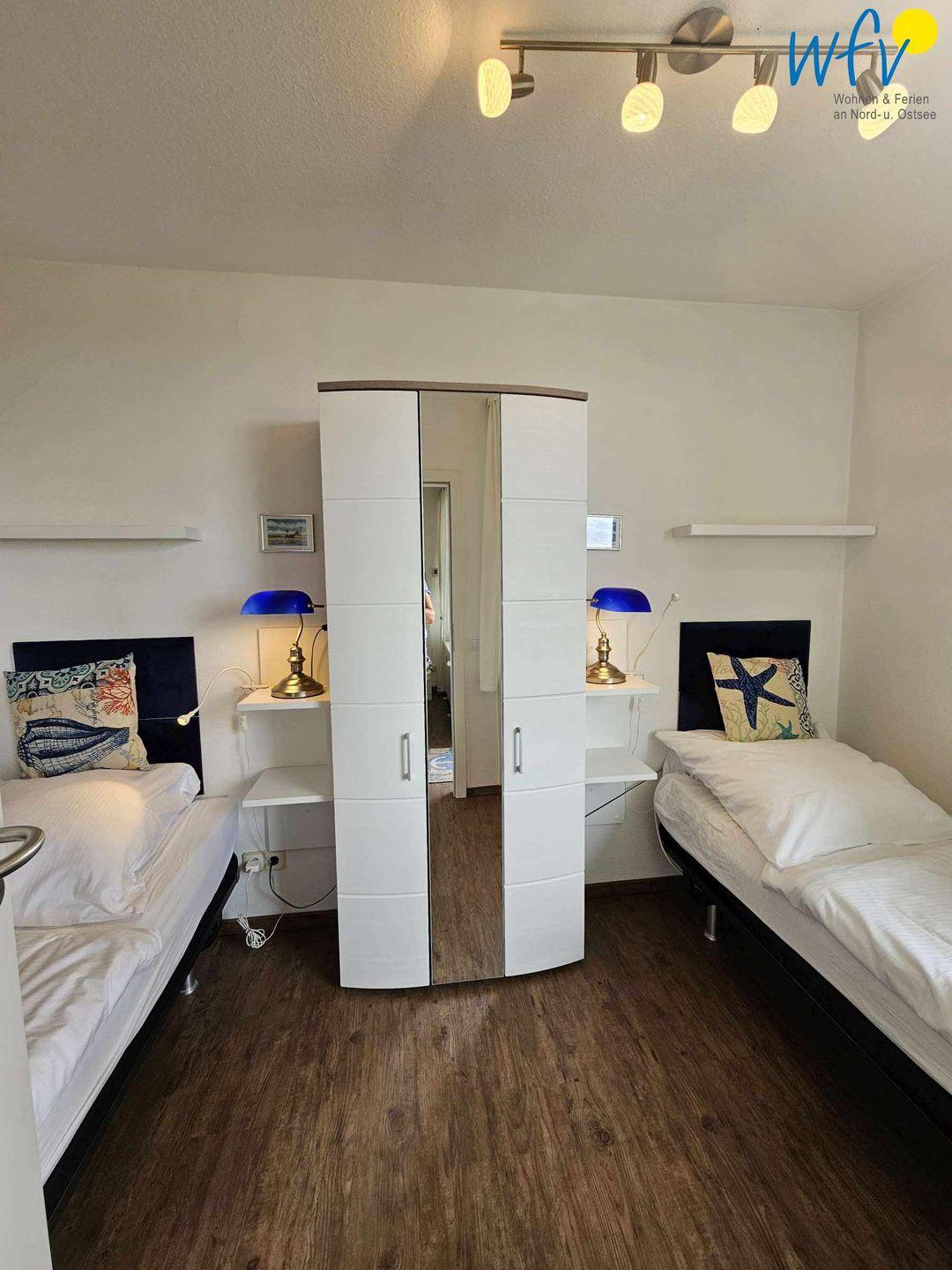 Im Schlafbereich des Wohnraums befindet sich ein Doppelbett (180 x 200 cm). Das separate Schlafzimmer ist mit zwei Einzelbetten und einem Kleiderschrank ausgestattet.