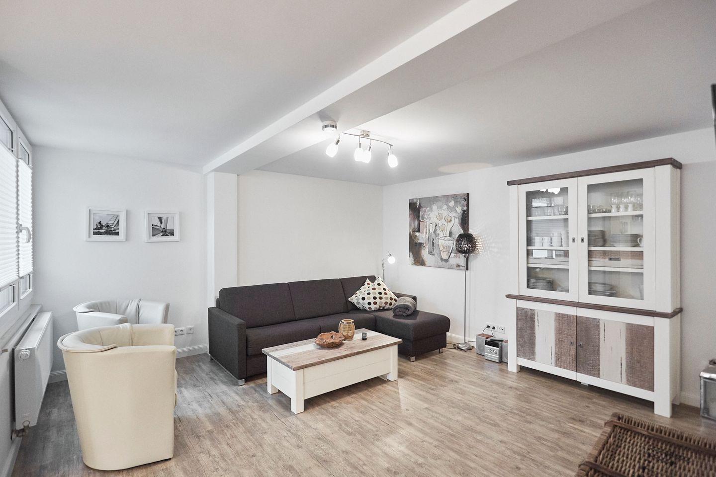 Im Herzen der Wohnung finden Sie die offene Küche, die zum Wohnzimmer hin gestaltet ist. Hier erwartet Sie eine voll ausgestattete Küchenzeile mit hochwertigen Geräten, darunter eine Mikrowelle und eine Spülmaschine. Angenehme Stunden sind garantiert, während Sie die gemeinsame Zeit am Esstisch im lichtdurchfluteten Wohnbereich genießen. Das Wohnzimmer besticht durch eine einladende Sofaecke (mit Schlafmöglichkeit) und moderne Unterhaltungstechnik wie einen TV mit internationalen Kanälen und eine HiFi-Anlage. WLAN ist selbstverständlich verfügbar, sodass Sie jederzeit online bleiben können.