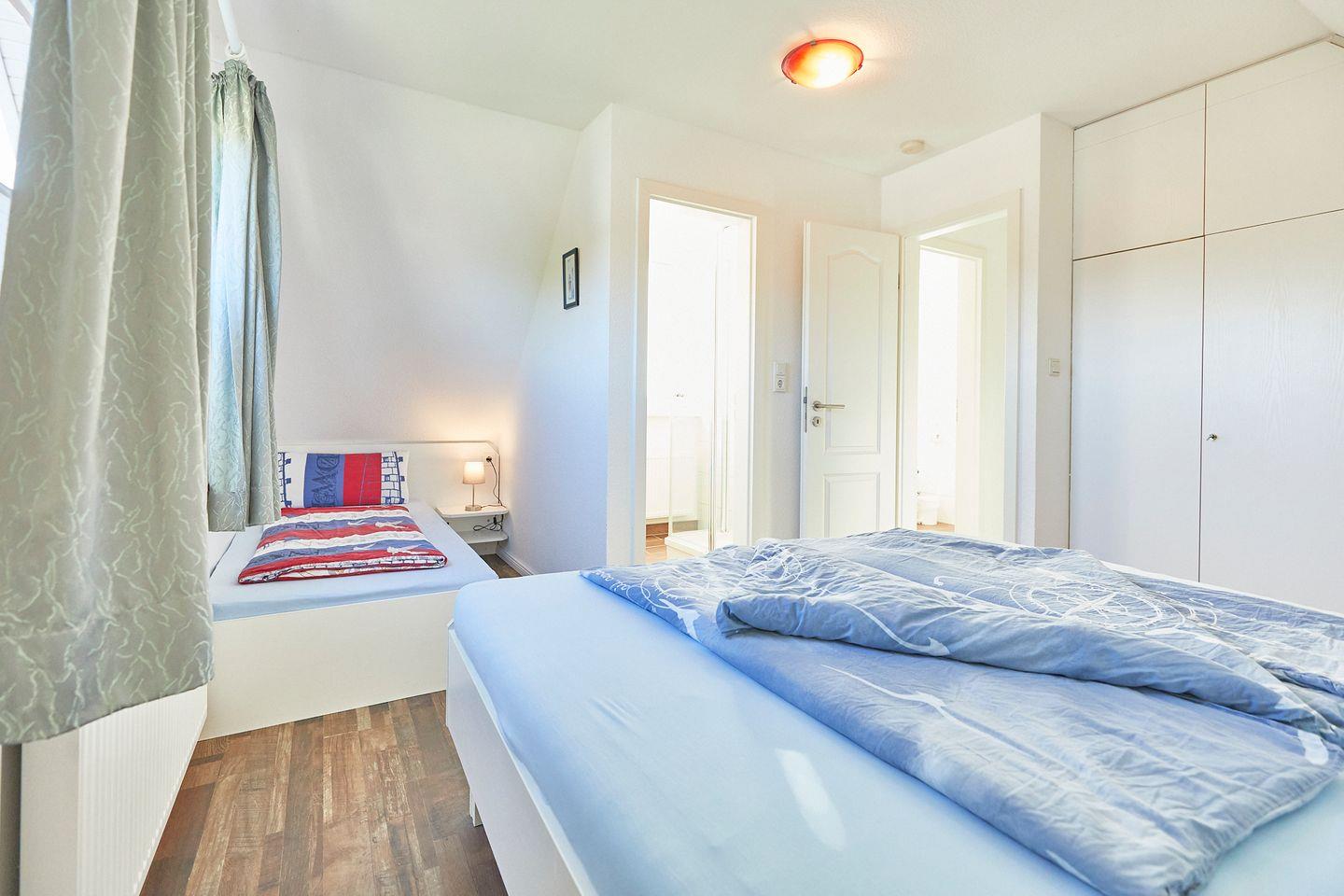 Das Wohnzimmer lädt zum Verweilen ein, mit hochwertigem Laminatboden und gemütlichen Möbeln, die zum Entspannen einladen. Nutzen Sie das kostenlose WLAN, um Ihre Erlebnisse online zu teilen oder einfach Ihre E-Mails zu prüfen. Ein Fernseher mit internationalen Kanälen sorgt für Unterhaltung, während Sie nach einem aufregenden Tag an der Nordsee entspannen können.