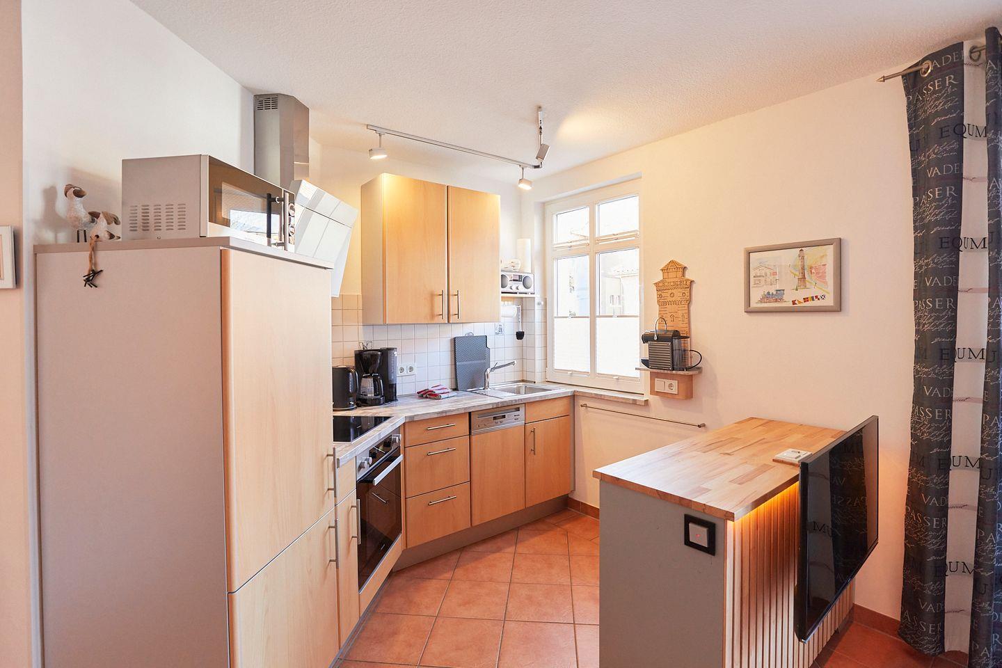 Die gut ausgestattete Küche ist ein wahres Paradies für Hobbyköche: Sie verfügt über einen Ceranherd, Backofen, Mikrowelle, Geschirrspüler und Kühlschrank mit Gefrierfach. Hier können Sie Ihre kulinarischen Fähigkeiten ausprobieren und leckere Mahlzeiten zubereiten, die Sie auf der sonnigen Terrasse mit Gartenmöbeln und einem Strandkorb genießen können – der perfekte Ort, um die frische Meeresbrise zu genießen!