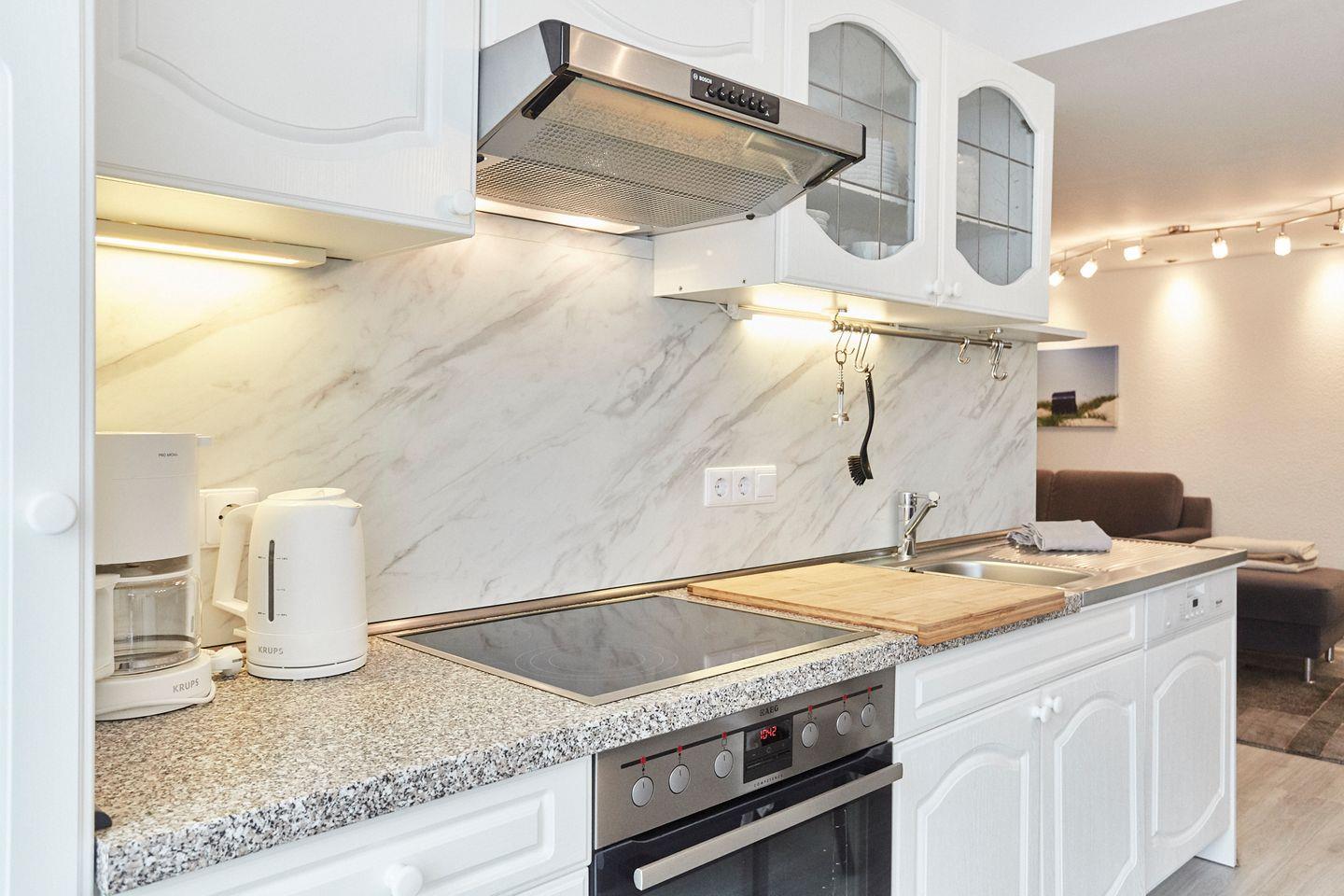 Das Ferienhaus ist kinderfreundlich und mit vielen Annehmlichkeiten ausgestattet, die Ihren Aufenthalt so angenehm wie möglich gestalten. Sie finden hier zwei komfortable Schlafzimmer, die mit Teppichboden ausgestattet sind und eine gemütliche Atmosphäre bieten. Die beiden Badezimmer warten mit einer Dusche bzw. einer Badewanne auf, ideal für entspannende Badezeiten nach einem erlebnisreichen Tag. Die offene Küche, die sich zum lichtdurchfluteten Wohnzimmer hin erstreckt, ist voll ausgestattet und lässt keine Wünsche offen. Von einem Cerankochfeld und Backofen bis hin zu einer Spülmaschine und einem Kühlschrank mit Gefrierfach – hier können Sie kulinarische Köstlichkeiten zubereiten und gemeinsam am Esstisch genießen.
