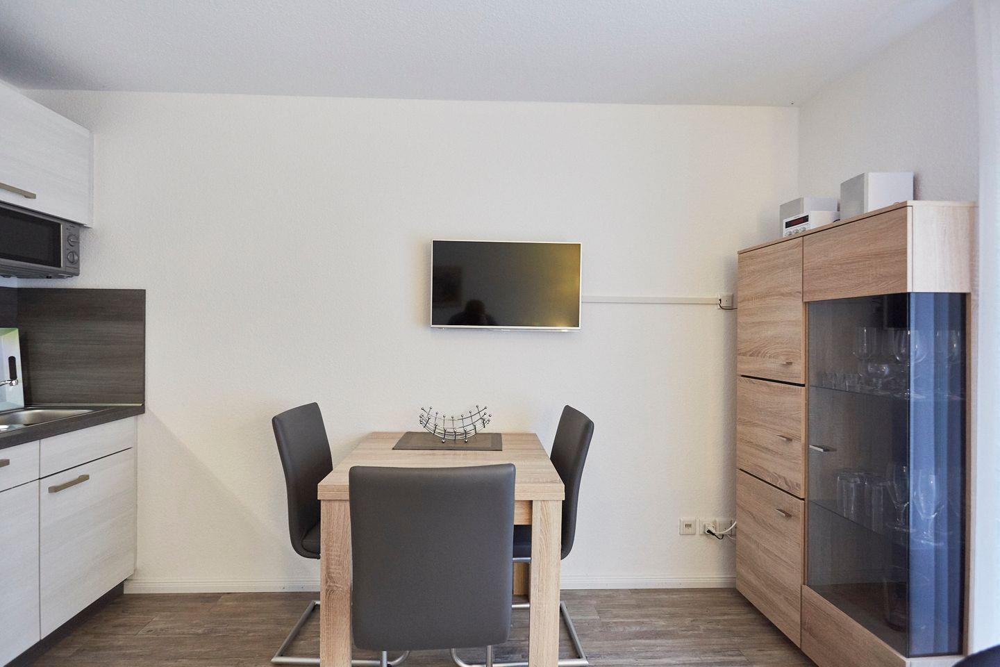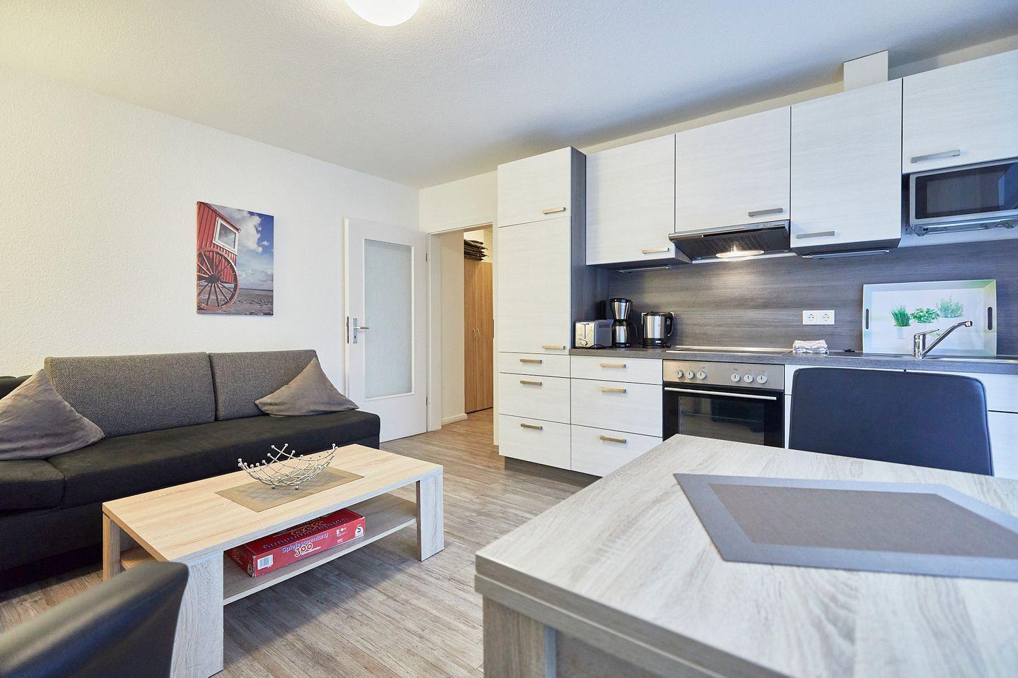 Die stilvolle Ferienwohnung verfügt über ein Schlafzimmer mit komfortablem Doppelbett und einem Wohnbereich, der mit einer gemütlichen Sofaecke (mit Schlafmöglichkeit) einlädt, um nach einem erlebnisreichen Tag zu entspannen. Die offene Küche ist bestens ausgestattet mit modernen Annehmlichkeiten wie einem Cerankochfeld, einem Backofen, einer Mikrowelle, einer Spülmaschine und einem Kühlschrank mit Gefrierfach. Dazu stehen Ihnen zahlreiche Küchenutensilien, eine Kaffeemaschine, ein Wasserkocher und sogar ein Toaster zur Verfügung, sodass Sie sich beim Frühstück oder dem abendlichen Dinner wie zu Hause fühlen können.