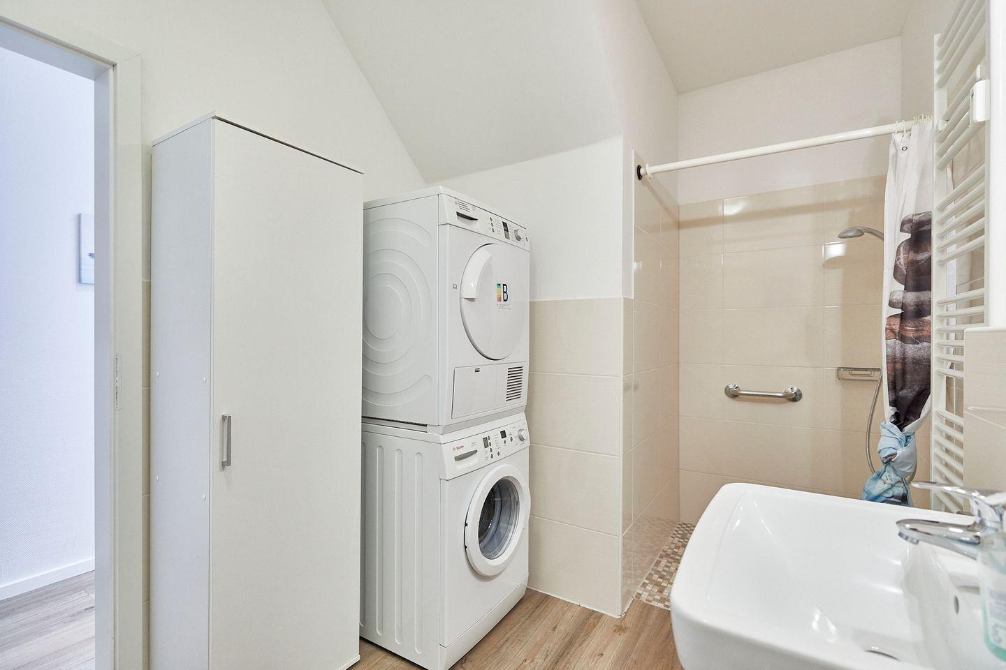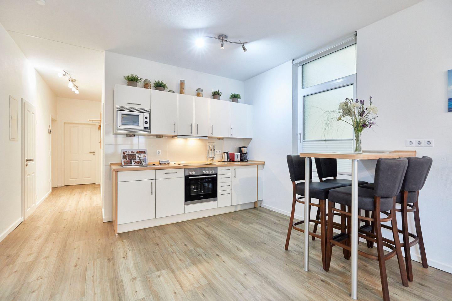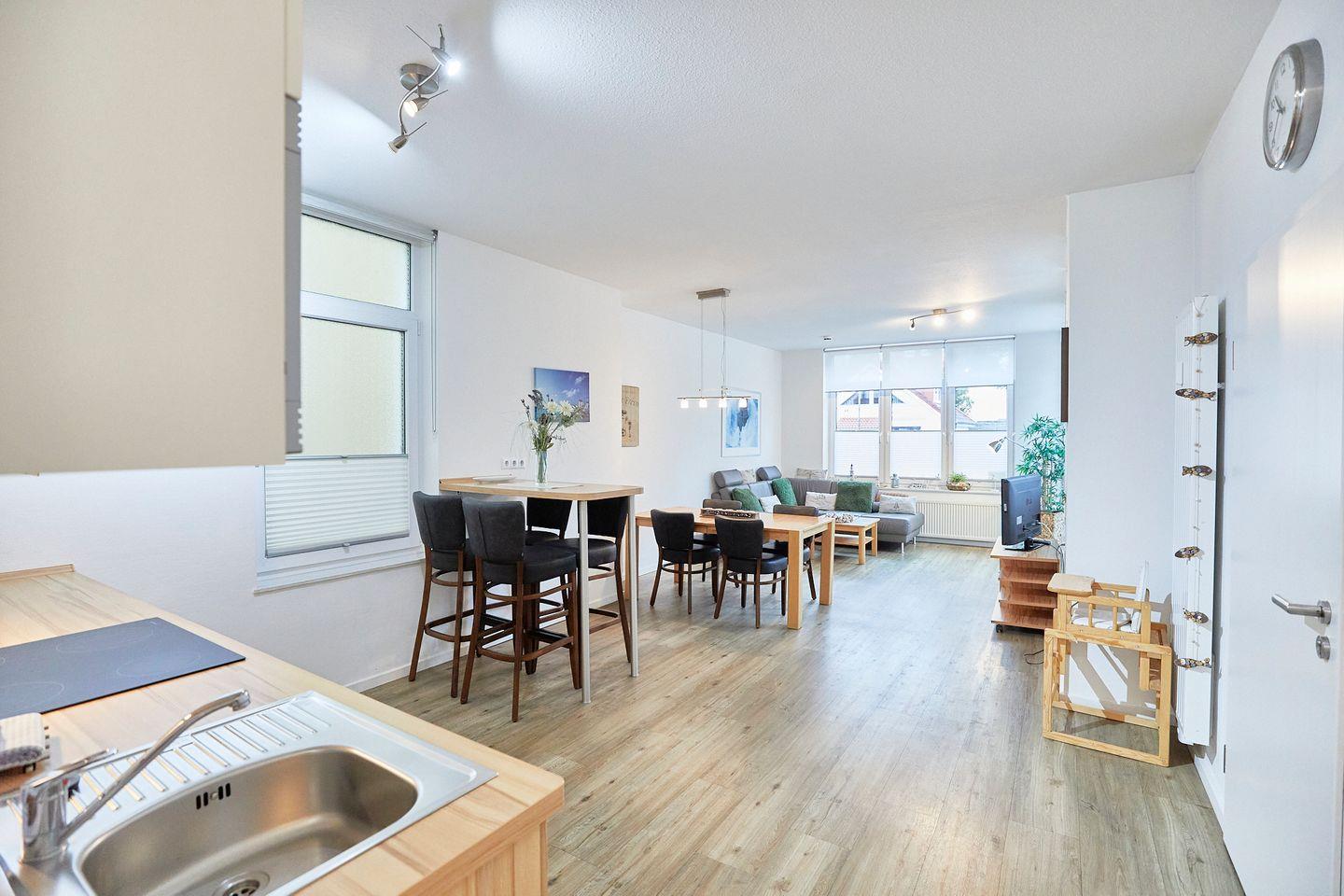 Die Ferienwohnung verfügt über zwei komfortable Schlafzimmer und bietet somit eine entspannte Nachtruhe für alle. Die beiden modernen Badezimmer, eines davon mit einer bodengleichen Dusche, sorgen für zusätzlichen Komfort und Privatsphäre. Für Familien mit Kindern oder Gästen, die einfach nur Wert auf Bequemlichkeit legen, ist die Ausstattung der Wohnung ideal; sowohl eine voll ausgestattete Küche als auch ein offenes Wohnzimmer laden zum gemeinsamen Kochen und Verweilen ein. Kochen Sie Ihr Lieblingsgericht in der modernen, offenen Küche, die mit einem Ceranherd, Backofen, Kühlschrank, Gefrierfach, Geschirrspüler und sämtlichen Küchenutensilien ausgestattet ist. Genießen Sie die frisch zubereiteten Mahlzeiten an dem einladenden Esstisch im Wohnzimmer oder auf der sonnigen Terrasse, die mit Gartenmöbeln ausgestattet ist und zum Entspannen an der frischen Luft einlädt.