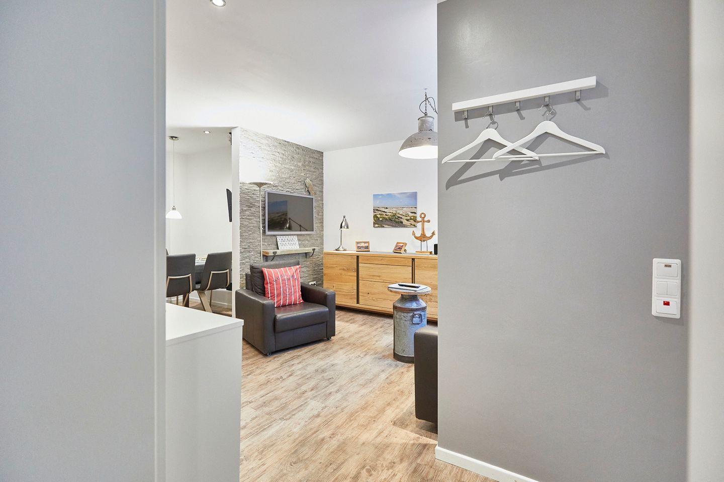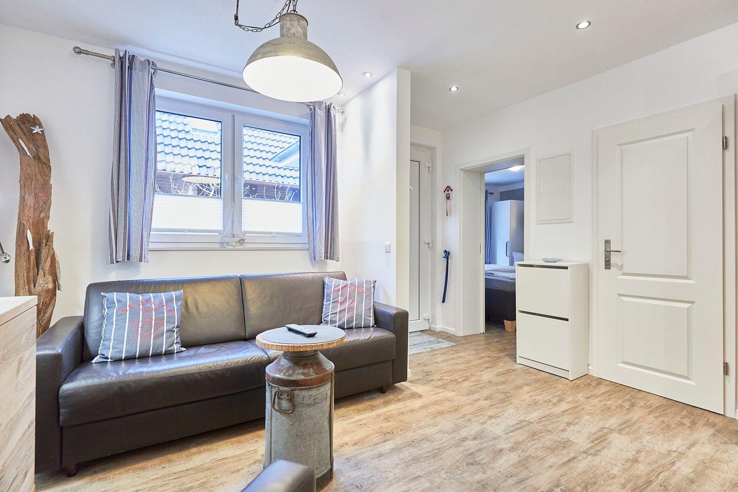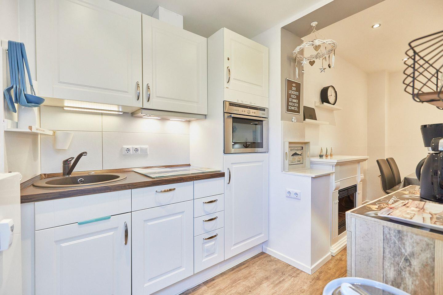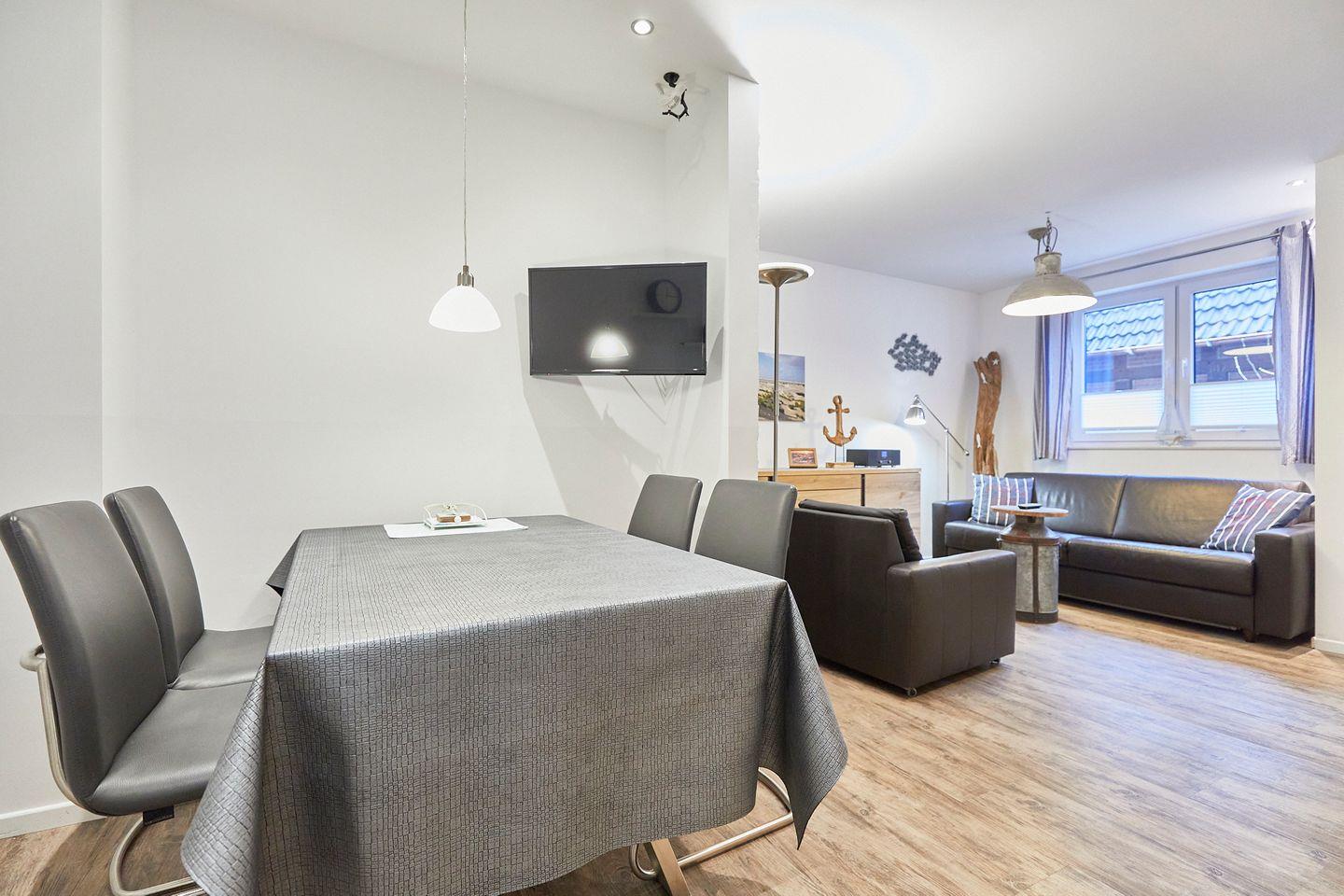 Die Wohnräume sind stilvoll und freundlich gestaltet. Das Wohnzimmer überzeugt mit einem hellen, luftigen Ambiente und einer gemütlichen Sofaecke, die sich perfekt zum Entspannen nach einem erlebnisreichen Tag eignet. Ein Esstisch lädt dazu ein, gemeinsame Mahlzeiten zu genießen. Sie haben die Möglichkeit, sich in der offenen Küche kulinarisch auszutoben, die mit allem ausgestattet ist, was Sie benötigen – darunter ein Herd, ein Backofen, eine Spülmaschine und eine umfassende Auswahl an Küchenutensilien.