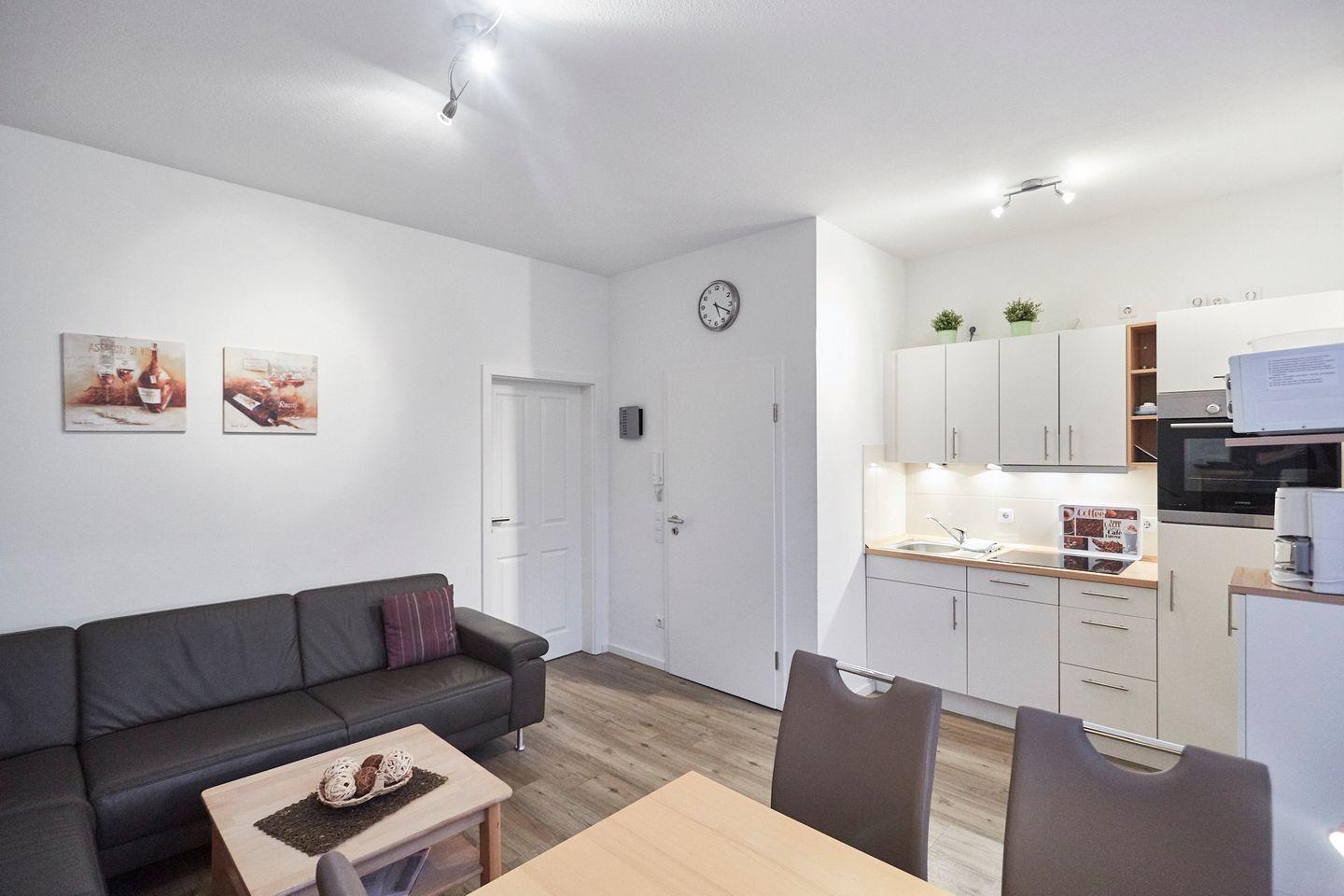 Die Wohnung erstreckt sich über den ersten Stock und ist geschmackvoll eingerichtet. Bei Betreten der Ferienwohnung werden Sie von einem einladenden Wohnzimmer empfangen, das mit einem bequemen Sofa und einem digitalen Fernseher ausgestattet ist – perfekt für entspannte Abendstunden. Die offene Küche, die zum Wohnbereich hin gestaltet ist, lässt keine Wünsche offen: sie verfügt über moderne Elektrogeräte wie einen Herd mit 4-Platten, Backofen, Kühlschrank mit Gefrierfach, Geschirrspüler und eine Mikrowelle. Hier können Sie Ihre Lieblingsgerichte zubereiten und im Essbereich gemütlich genießen.