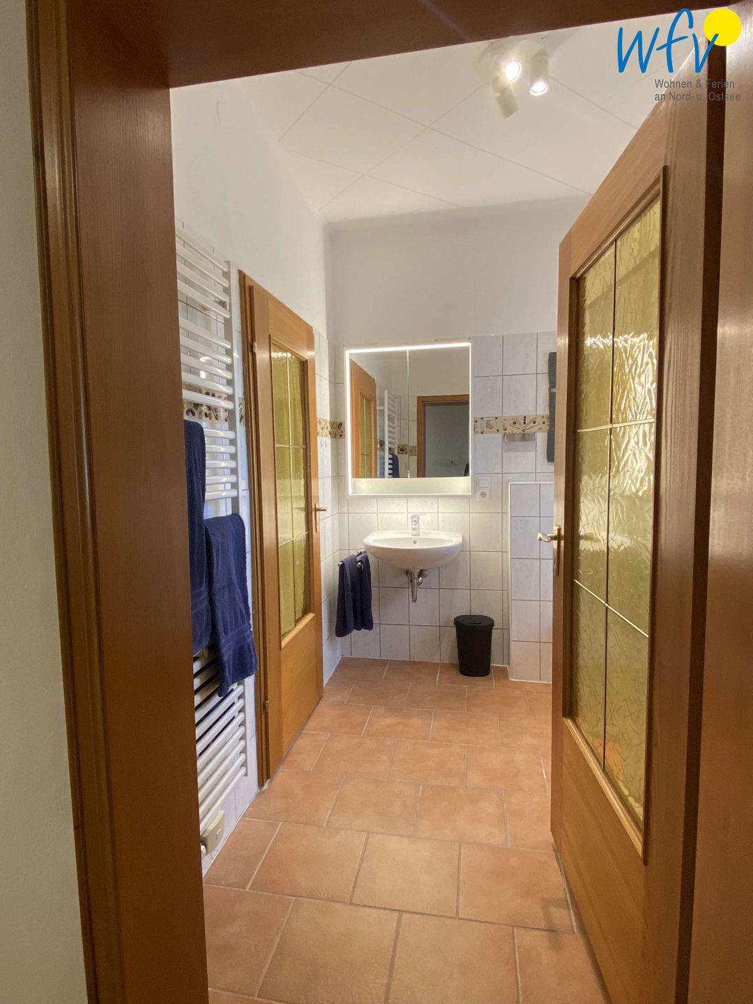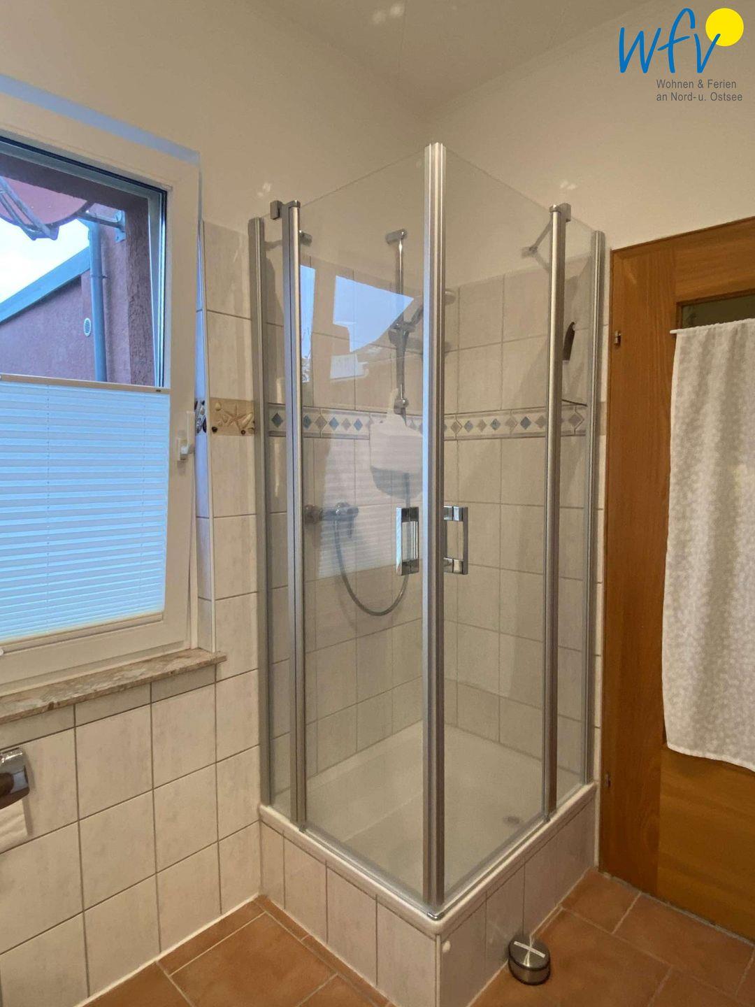 Das gepflegte Tageslichtbad mit Dusche, Waschbecken und WC sowie Handtuchheizkörper, Kosmetikspiegel und Föhn ergänzt den Wohnkomfort.