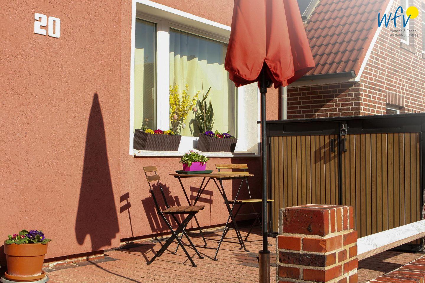 Wohltuende Nordseeluft können Sie auf der kleinen möblierten Terrasse vor dem Haus genießen. (Fahrräder dürfen hier gerne abgestellt werden.) Oder Sie unternehmen einen Ausflug zum nahgelegen Badestrand: Seit diesem Jahr (2025) ist am Ende der Von-Frese-Straße (200 m) ein vom DLRG bewachter Strandabschnitt eingerichtet worden. In der nächsten Saison wird dieser während der Schulferien von Niedersachsen und NRW wieder dort sein (2.7.-1.9.2026).