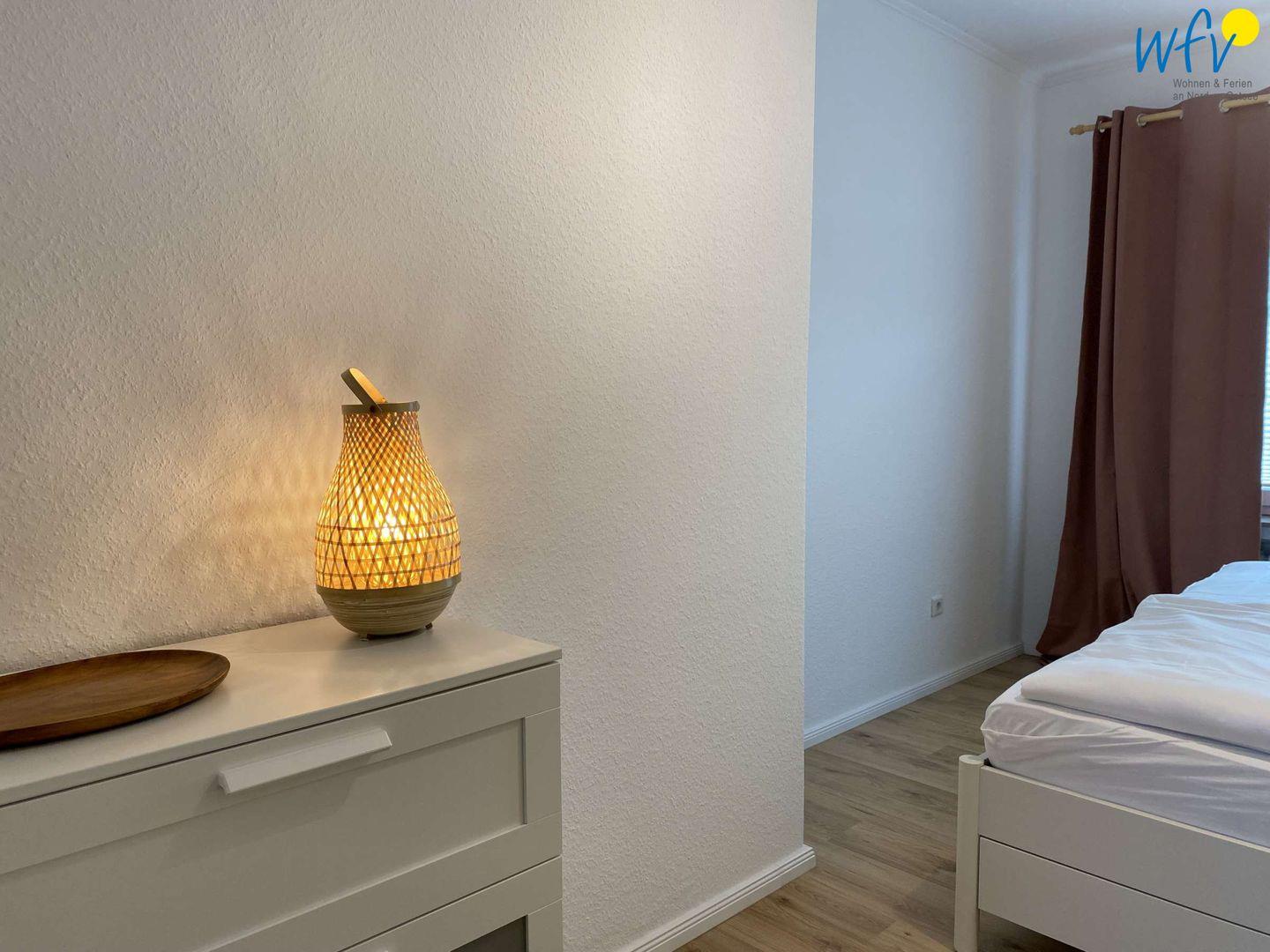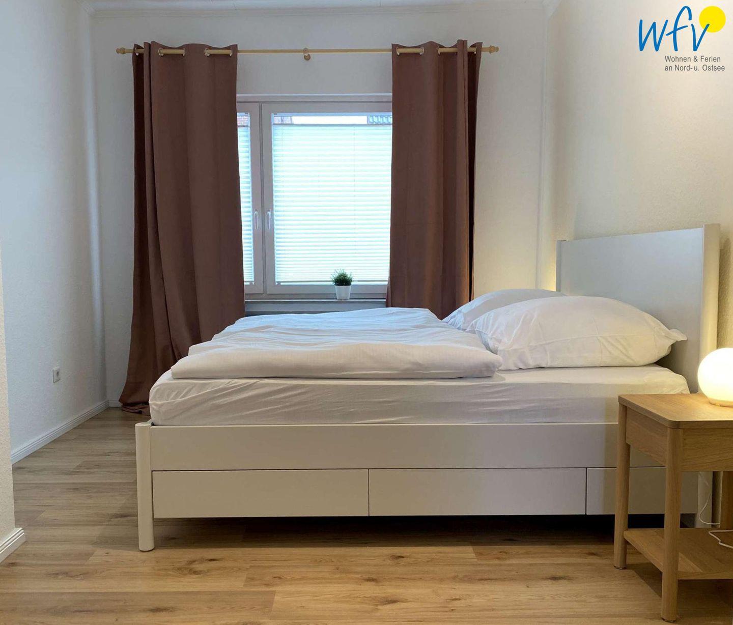 Wenn auf Borkum die Nachtruhe einkehrt, bietet Ihnen das separate Schlafzimmer mit Doppelbett einen schönen Ort zum Ausschlafen. Die Matratzen haben eine Maße von 2 x 90 x 200 cm und sind Wendematratzen, die auf der einen Seite über Härtegrad 2 und auf der anderen Seite über Härtegrad 3 verfügen. Für Ihre Urlaubsgarderobe befinden sich im Zimmer ein Kleiderschrank und eine Kommode.