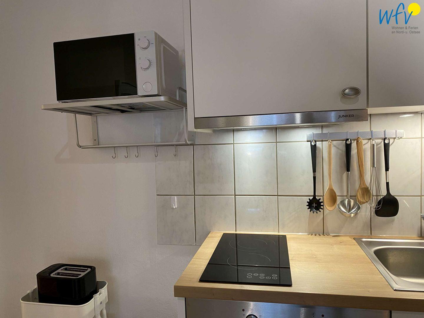 Für die Selbstverpflegung steht Ihnen eine moderne Küchenzeile zur Verfügung - u.a. mit einem 2-Platten-Ceranherd, einem Backofen, einer Mikrowelle und einer Spülmaschine sowie einem Essplatz.