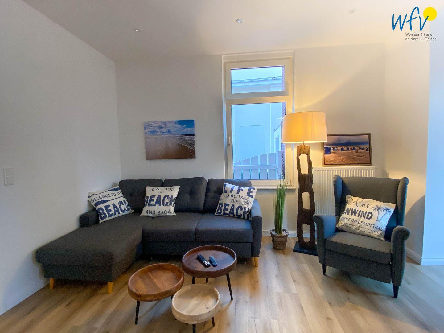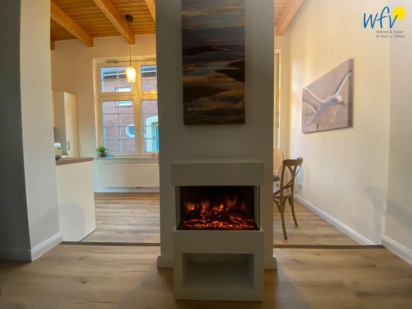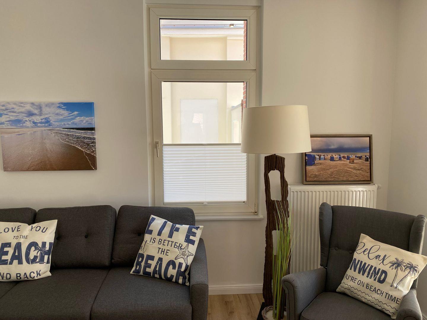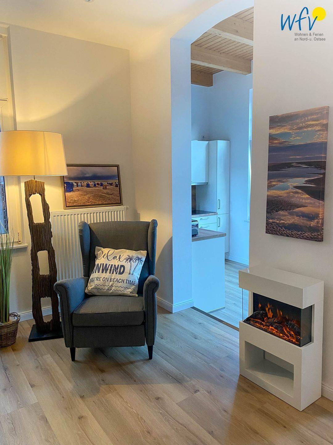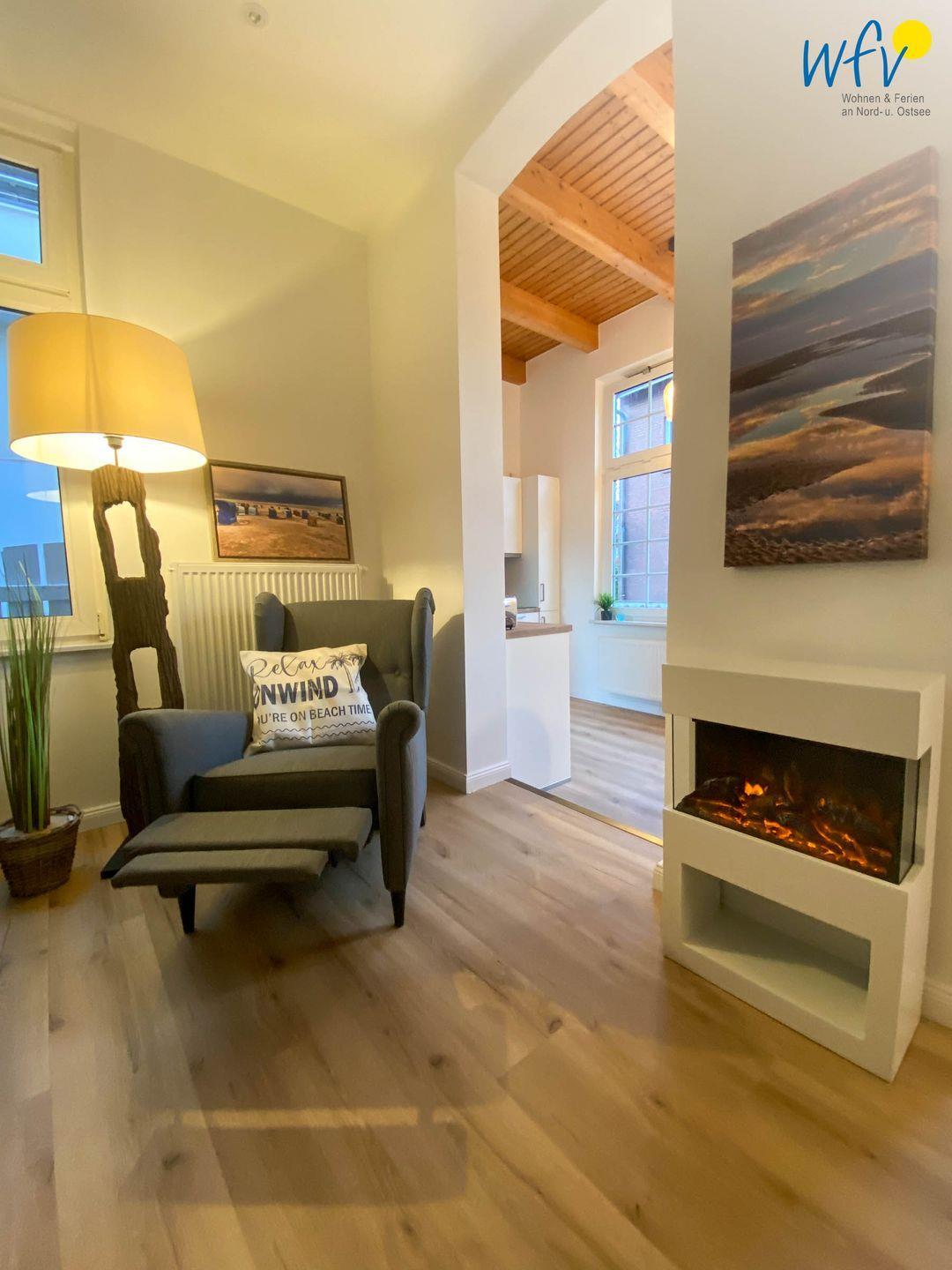 Die Sofalandschaft mit Relaxsessel, einem 43 Zoll-Fernseher und Elektrokamin laden auch im Winter zum Entspannen ein. Genießen Sie diese Wohlfühloase nach langen Strandspaziergängen im Sommer, wie im Winter mit einem heißen Ostfriesentee!