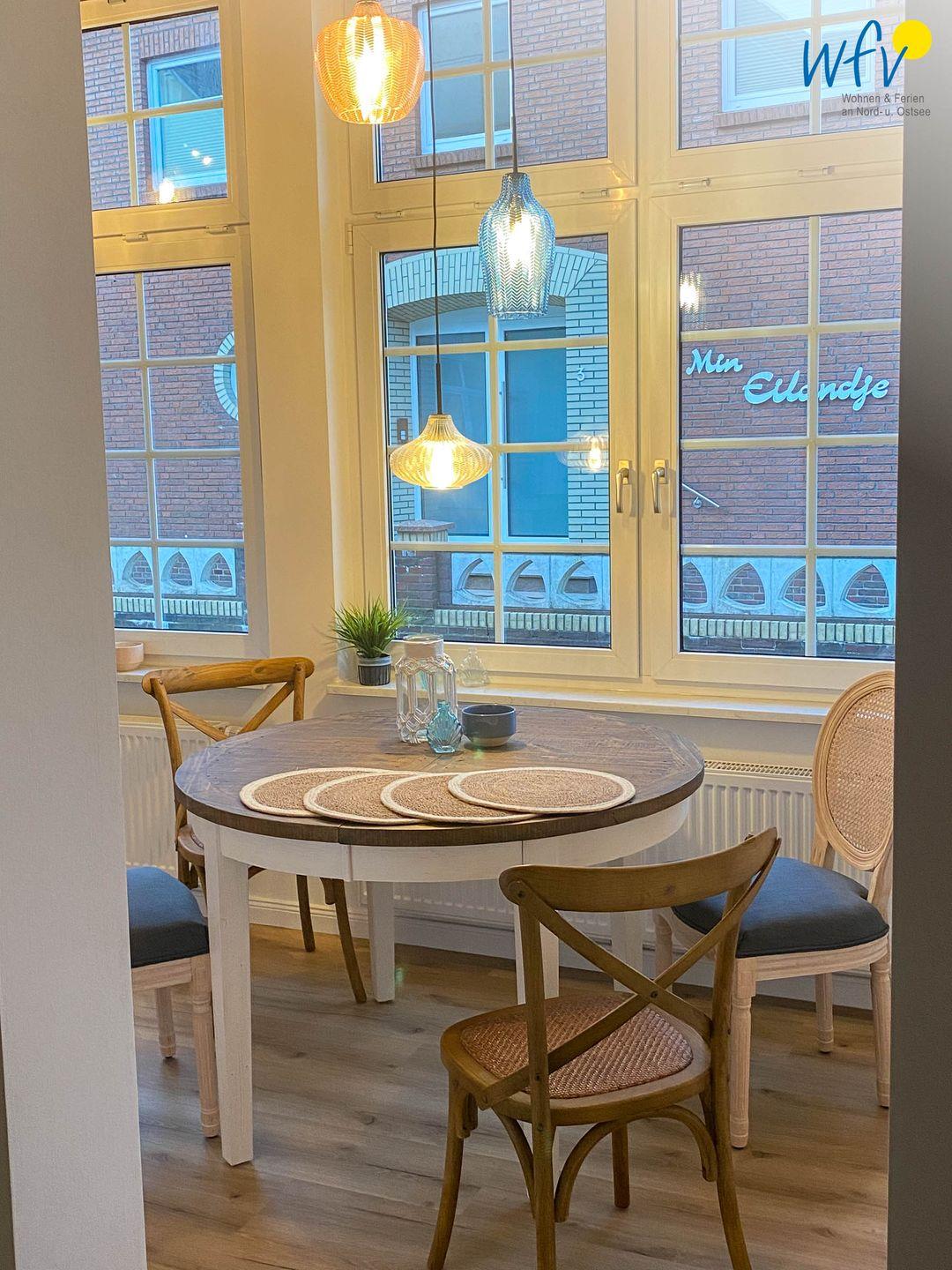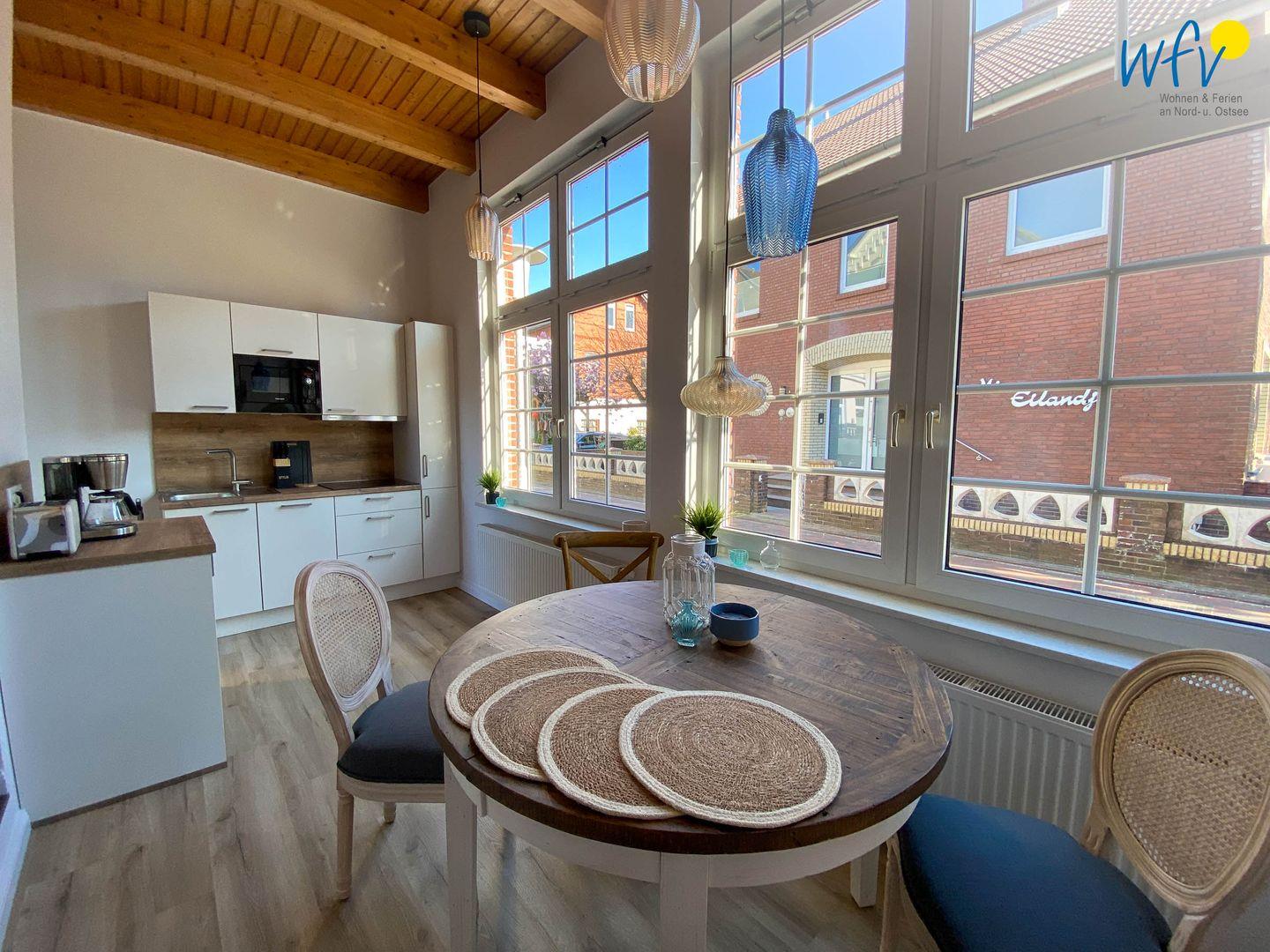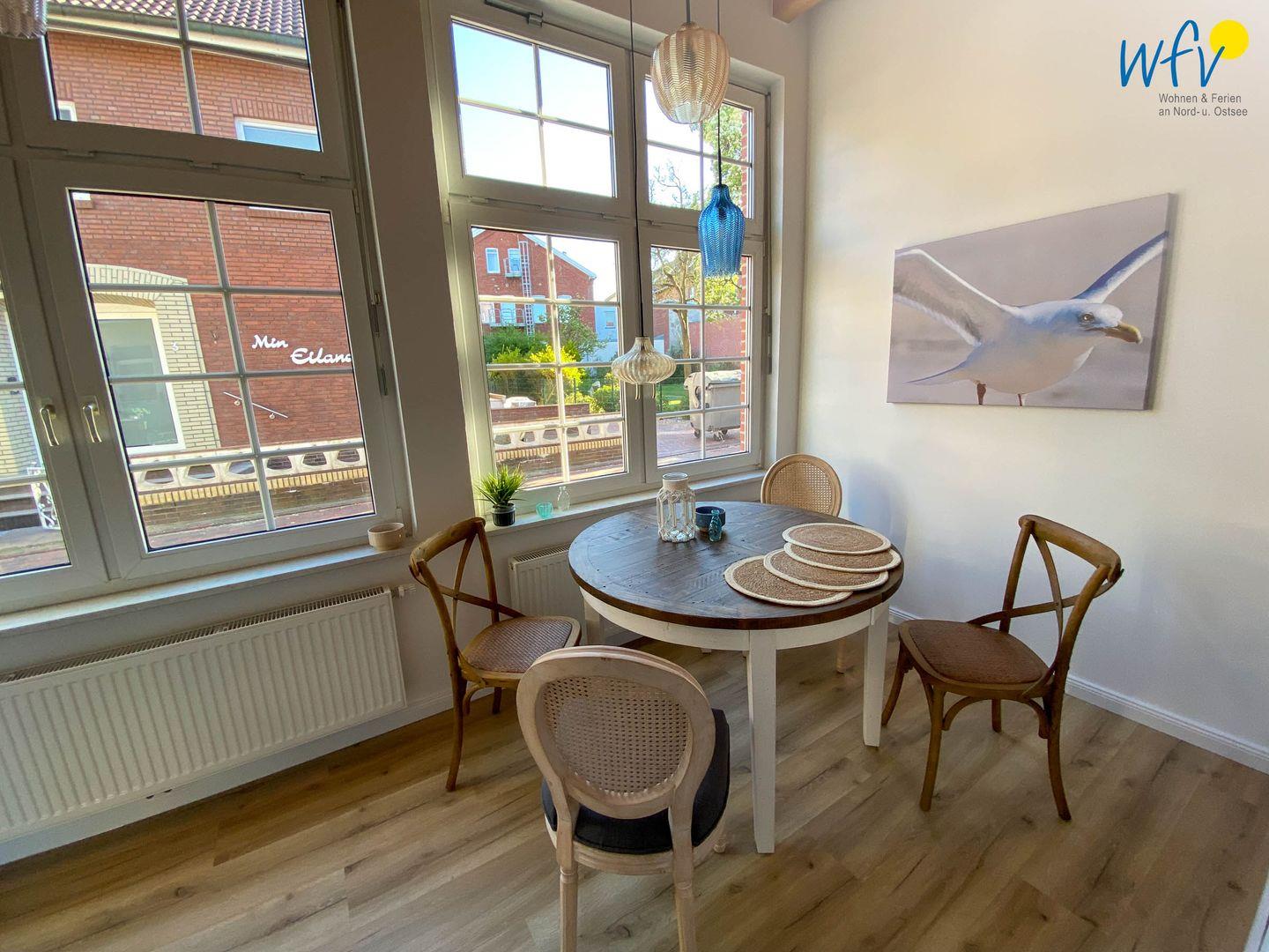 Die Ferienwohnung erstreckt sich über eine großzügige Fläche und liegt im rechten Erdgeschoss des Hauses. Durch den offen gestalteten Wohnbereich, die hohen Decken und die Torbögen erhält man einen herrlichen, licht durchflutenden Blick in die für Borkum typische, nach Süden ausgerichtete Veranda. In dieser befindet sich die Küche mit einem einladenden Essbereich. Die gut ausgestattete Küche lädt dazu ein, kulinarische Köstlichkeiten zuzubereiten. Sie finden hier alles, was Sie benötigen - vom Induktionsherd über Mikrowelle bis hin zum Kühlschrank. Ofenwarme Brötchen bekommen Sie beim Bäcker direkt um die Ecke. Oder Sie lassen sich mit dem leckeren Frühstück in "Ria's Beach" verwöhnen. WFV-Gäste genießen in dem gemütlichen Café mit Nordseeblick ein besonderes, exklusives Angebot: Kinder von 0–6 Jahren erhalten einen „Räuberteller“ und können kostenlos bei den Eltern mitessen. Kinder von 6–12 Jahren zahlen 12,00 € pro Frühstück. Ab 12 Jahren beträgt der Preis 20,00 € pro Person. "Ria's Beach" erreichen Sie nach nur 10 Gehminuten (4 Minuten Radweg).
