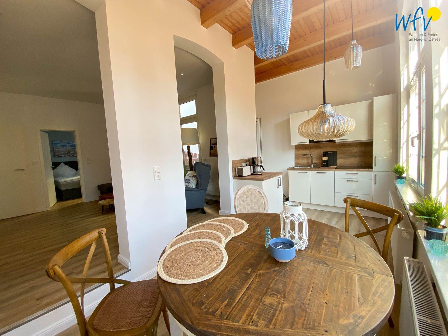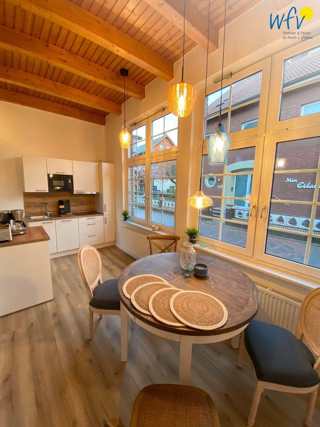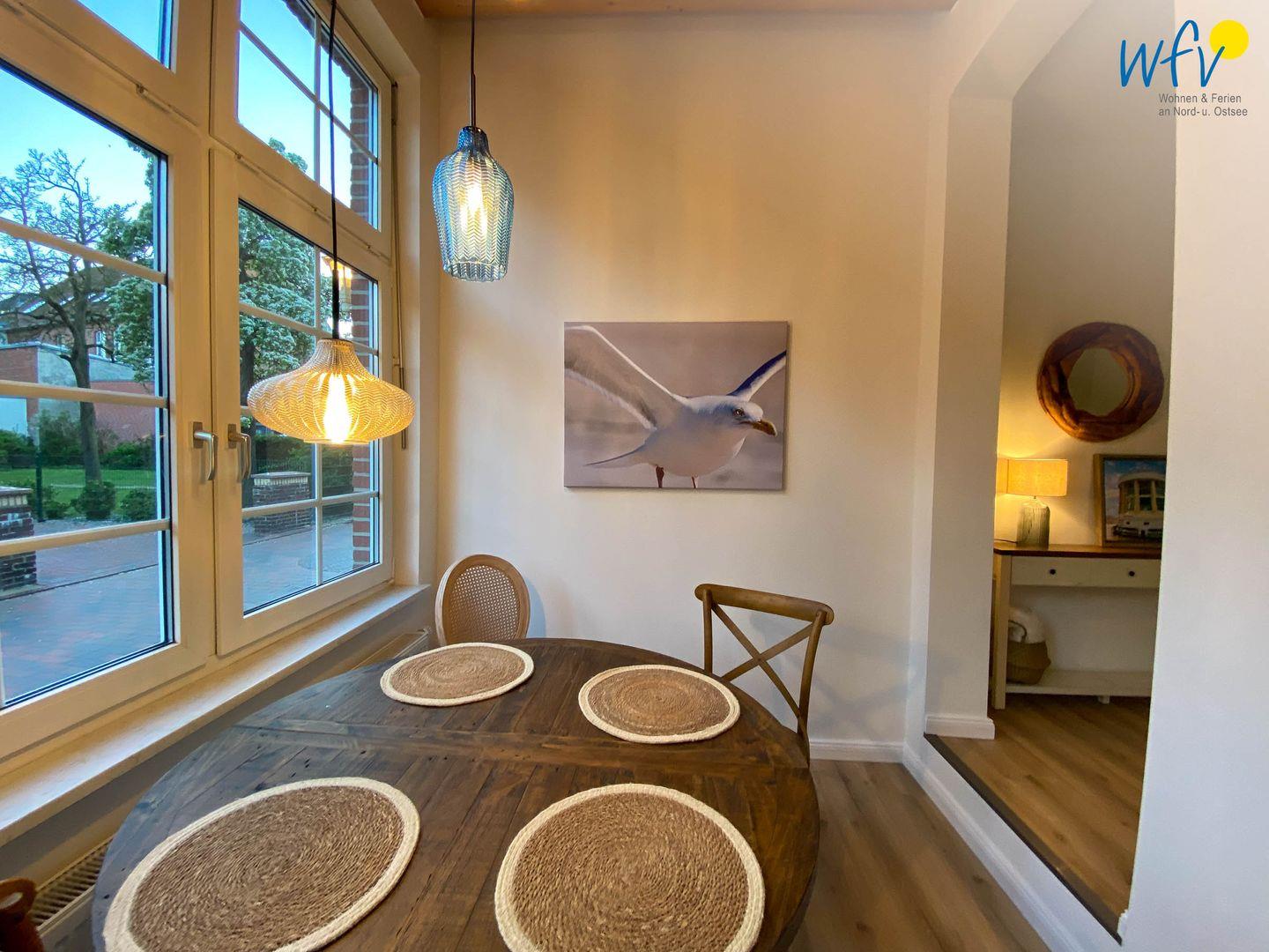 Die Ferienwohnung erstreckt sich über eine großzügige Fläche und liegt im rechten Erdgeschoss des Hauses. Durch den offen gestalteten Wohnbereich, die hohen Decken und die Torbögen erhält man einen herrlichen, licht durchflutenden Blick in die für Borkum typische, nach Süden ausgerichtete Veranda. In dieser befindet sich die Küche mit einem einladenden Essbereich. Die gut ausgestattete Küche lädt dazu ein, kulinarische Köstlichkeiten zuzubereiten. Sie finden hier alles, was Sie benötigen - vom Induktionsherd über Mikrowelle bis hin zum Kühlschrank. Ofenwarme Brötchen bekommen Sie beim Bäcker direkt um die Ecke. Oder Sie lassen sich mit dem leckeren Frühstück in "Ria's Beach" verwöhnen. WFV-Gäste genießen in dem gemütlichen Café mit Nordseeblick ein besonderes, exklusives Angebot: Kinder von 0–6 Jahren erhalten einen „Räuberteller“ und können kostenlos bei den Eltern mitessen. Kinder von 6–12 Jahren zahlen 12,00 € pro Frühstück. Ab 12 Jahren beträgt der Preis 20,00 € pro Person. "Ria's Beach" erreichen Sie nach nur 10 Gehminuten (4 Minuten Radweg).