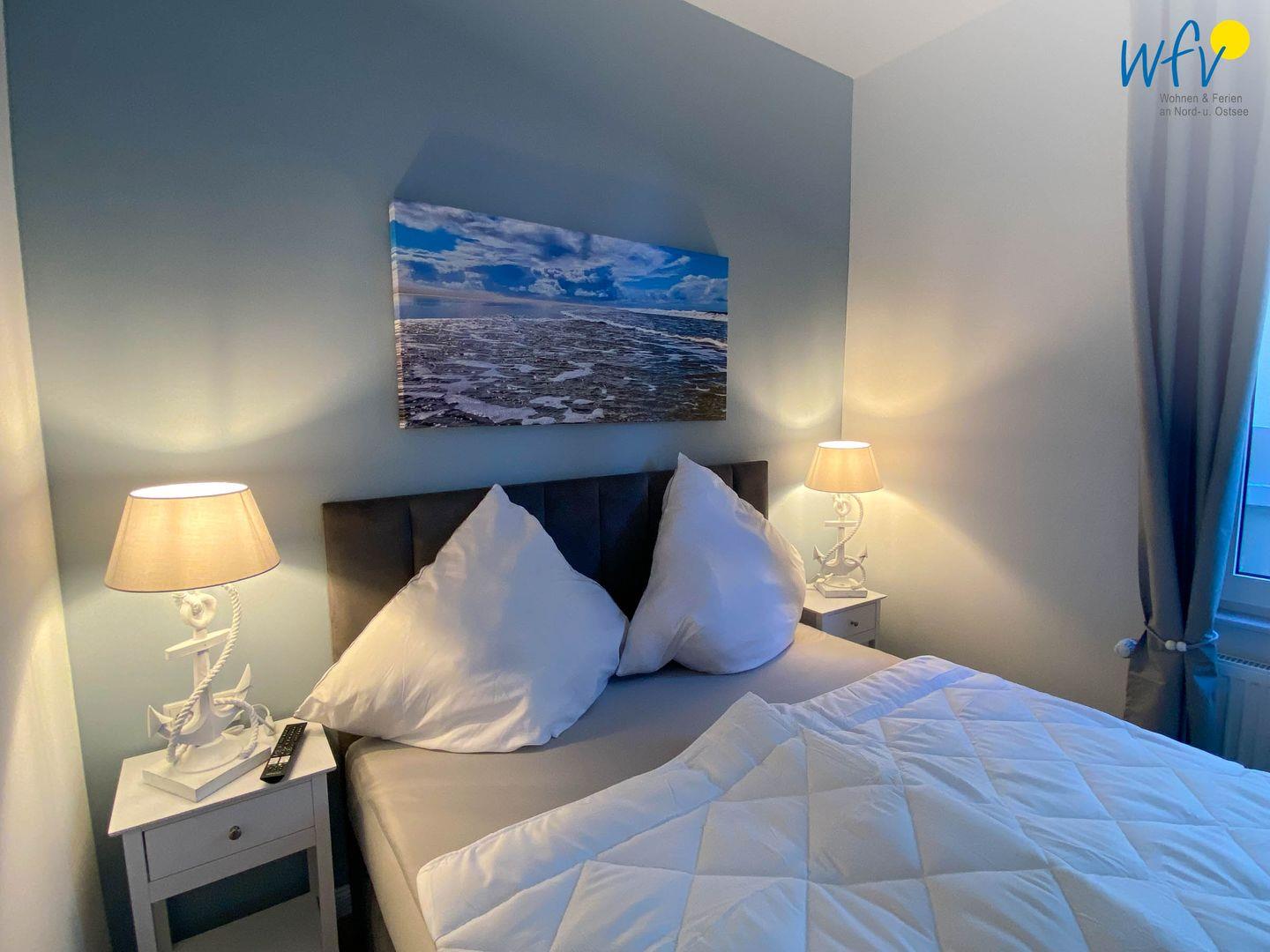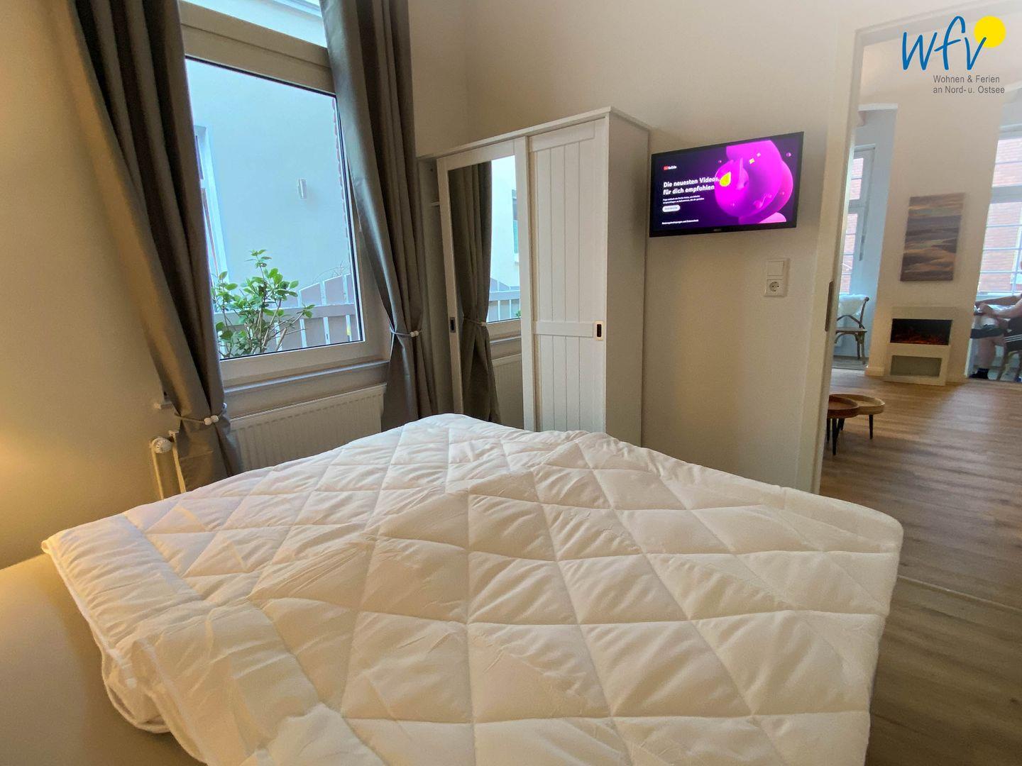 Das dem Wohnbereich angrenzende, gemütliche Schlafzimmer mit 7-Zonen-Taschenmatratzen-Boxspringbett mit Topper (160 x 200 cm), Verdunklung und internetfähigem Fernseher lädt zum Verweilen ein und verspricht erholsame Nächte. Genügend Stauraum bieten neben dem Kleiderschrank die beidseitig leicht aufstellbaren, geräumigen Bettkästen des Boxspringbettes.