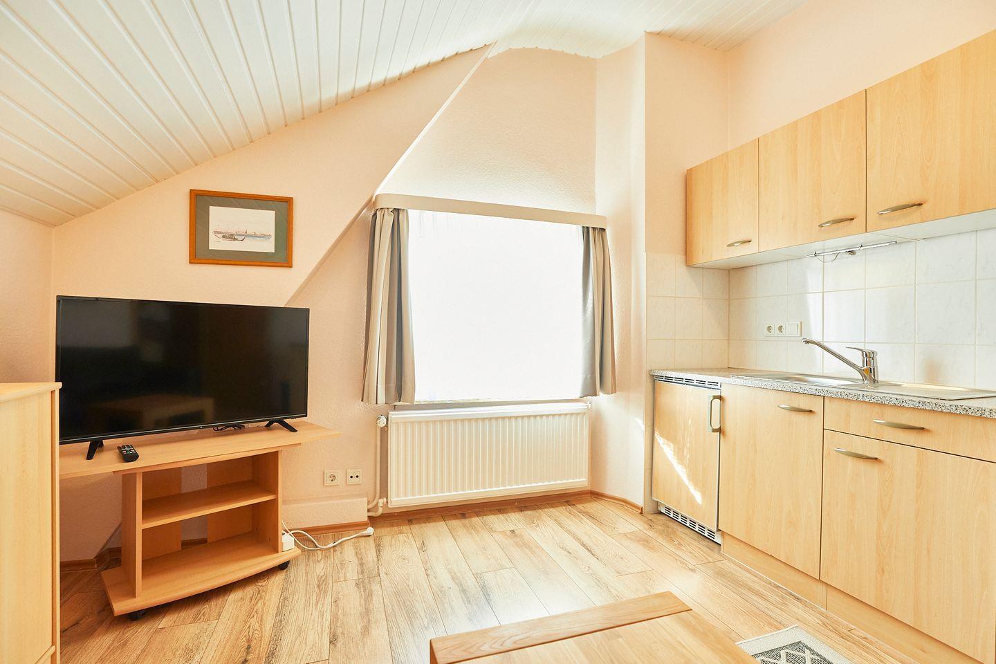 Das Studio 10 befindet sich im Dachgeschoss des Hauses. Es bietet einen Eingangsbereich mit Garderobe, Schlafzimmer mit Doppelbett und ein Wohnzimmer mit Teeküche und Blick auf den Neuen Leuchtturm. Das Tageslichtbad ist mit Dusche und WC ausgestattet.