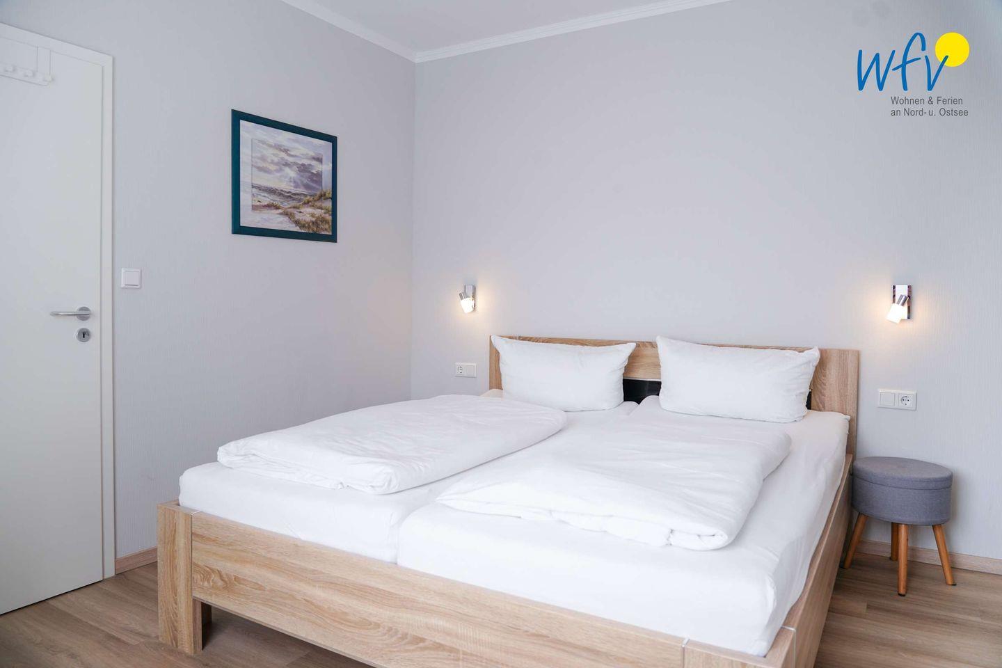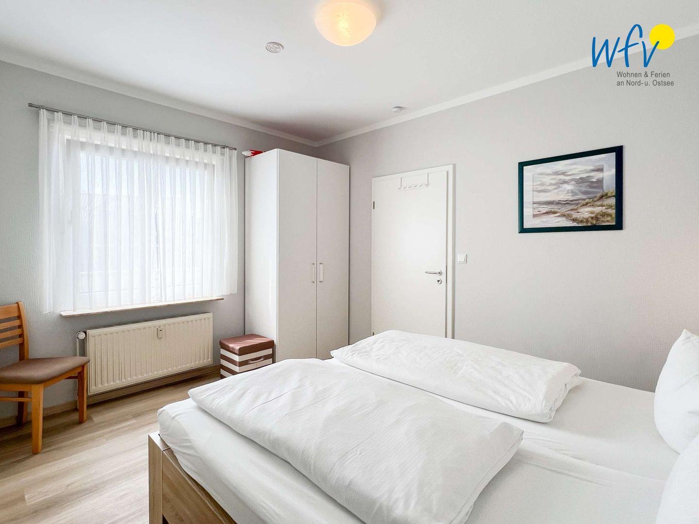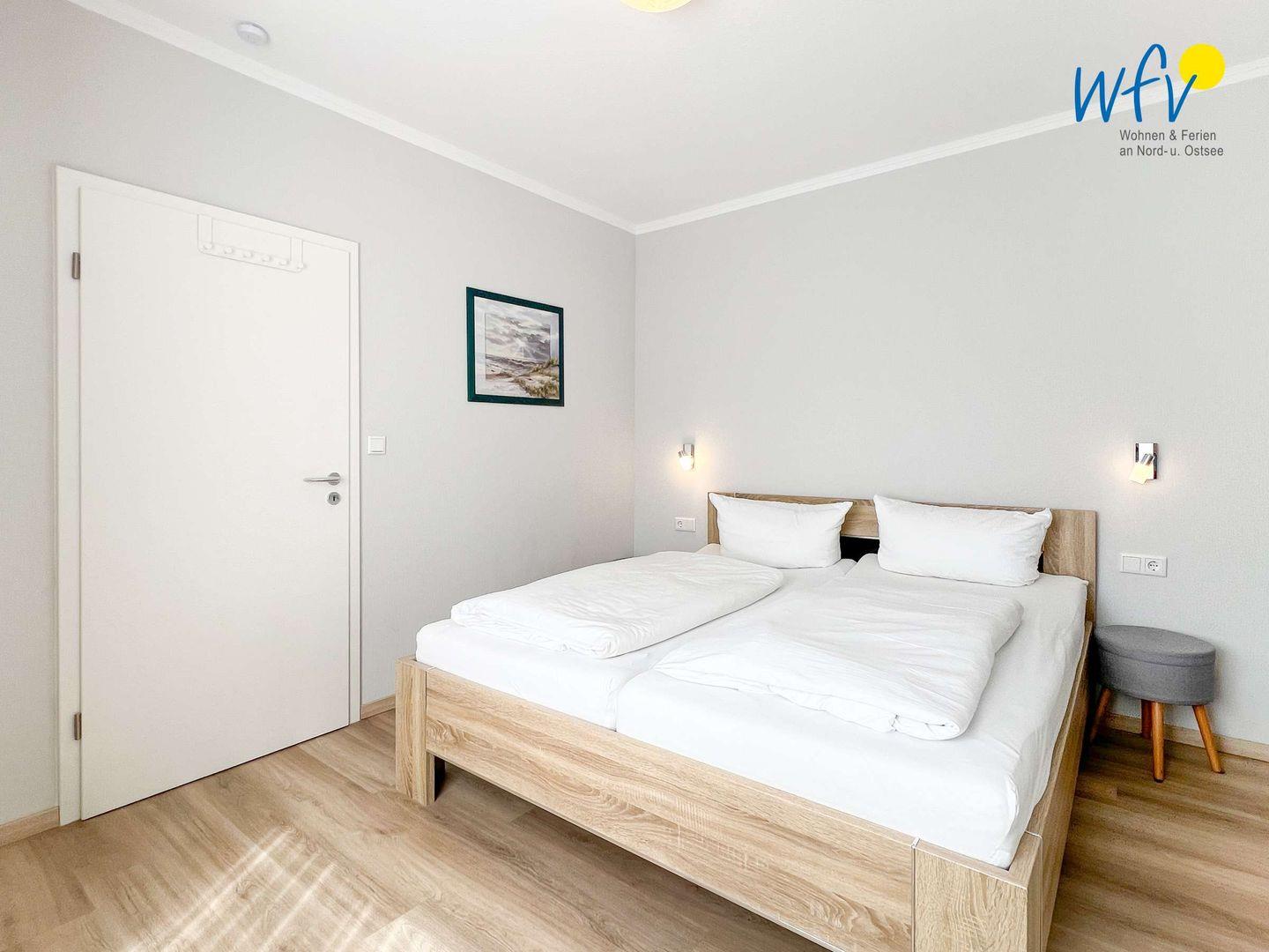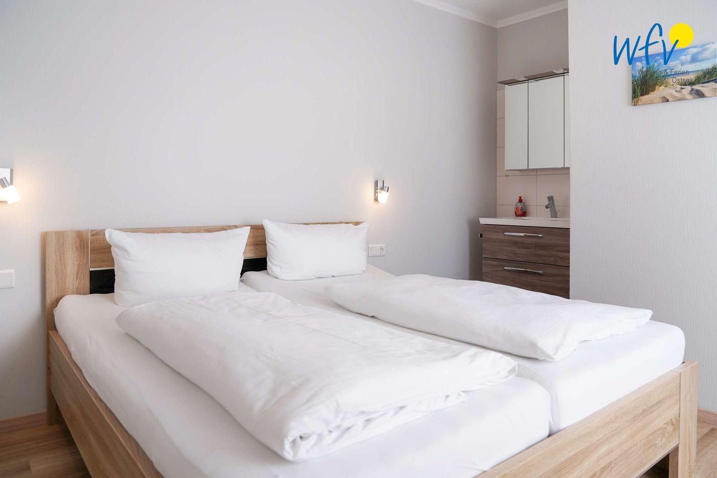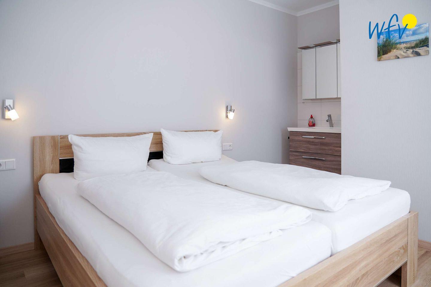 Das separate Schlafzimmer ist mit einem bequemen Doppelbett (180 cm x 200 cm) ausgestattet. Ein Kleiderschrank bietet Platz für Ihre Urlaubsgarderobe, ein integrierter Waschbereich mit Waschtisch und Spiegel sorgt für zusätzlichen Wohnkomfort.