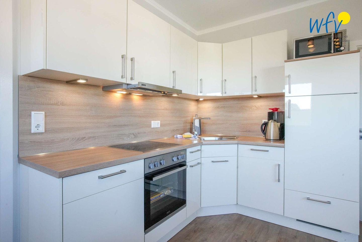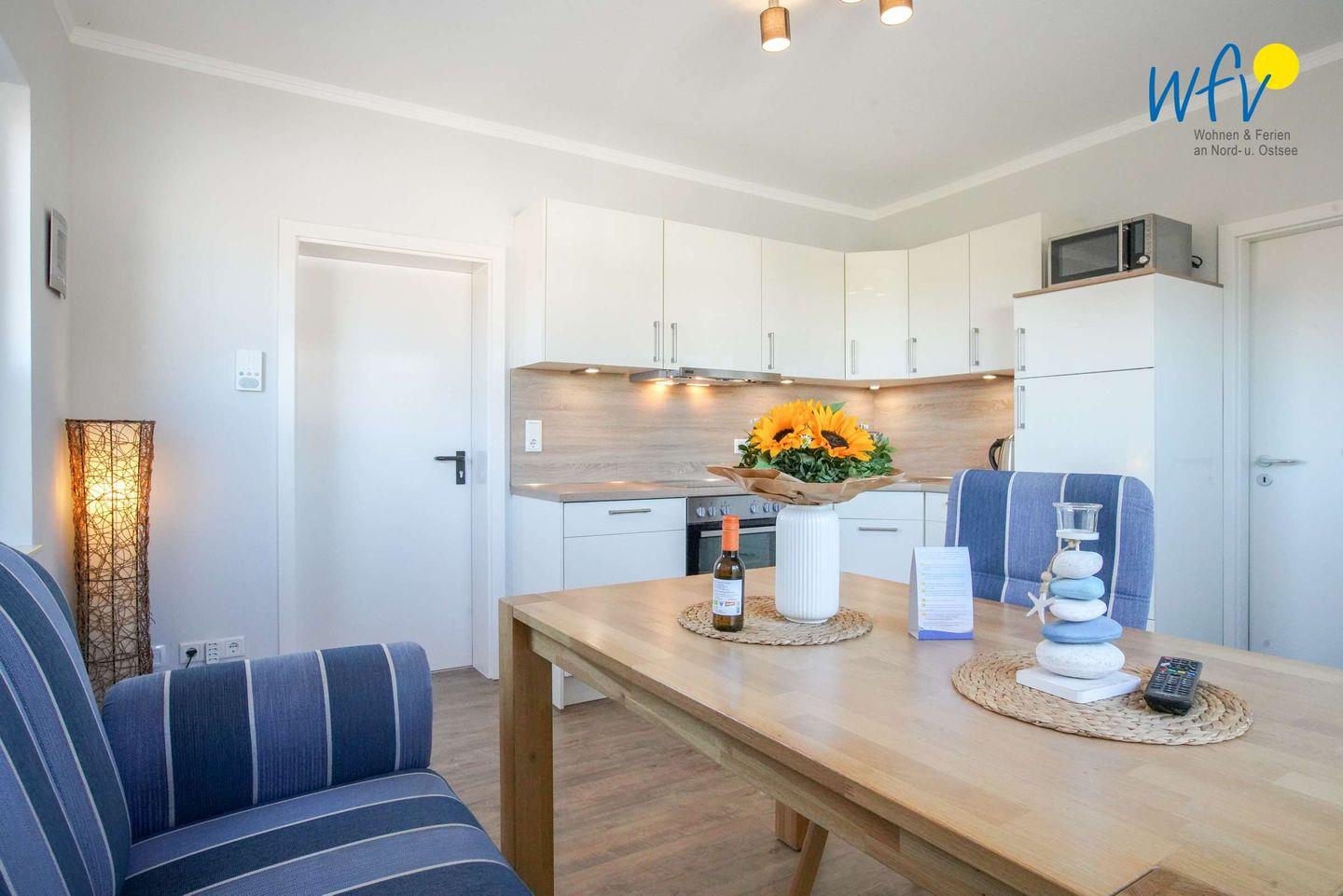 Warme Frühstücksbrötchen, kleine Snacks für den Ausflug oder leckere Mahlzeiten lassen sich schnell und einfach in der modernen Küchenzeile mit Cerankochfeld, Backofen, Mikrowelle, Geschirrspüler und Kühlschrank mit Gefrierfach zubereiten. Kaffeegourmets können zwischen einer klassischen Kaffeemaschine und einem Senseo-Automaten (Pads) wählen.