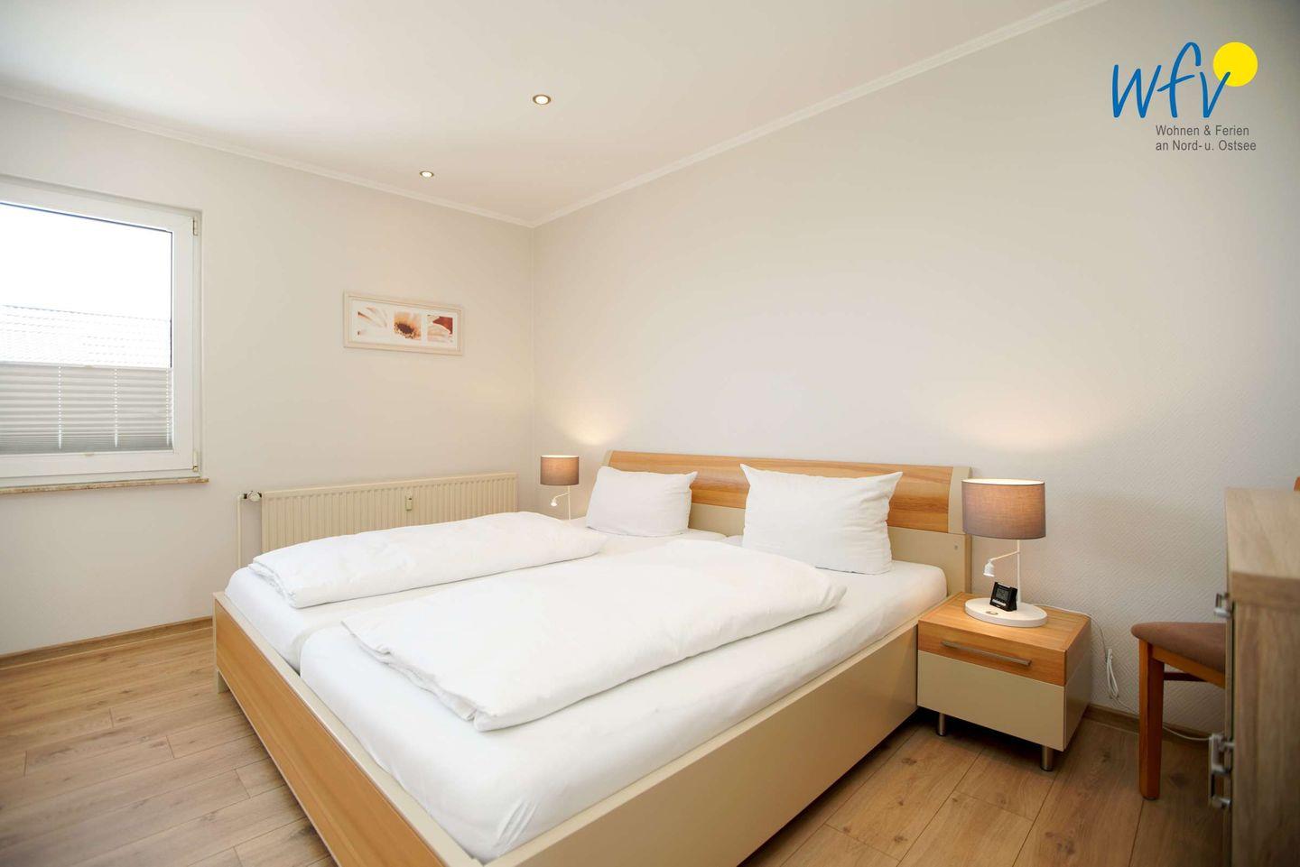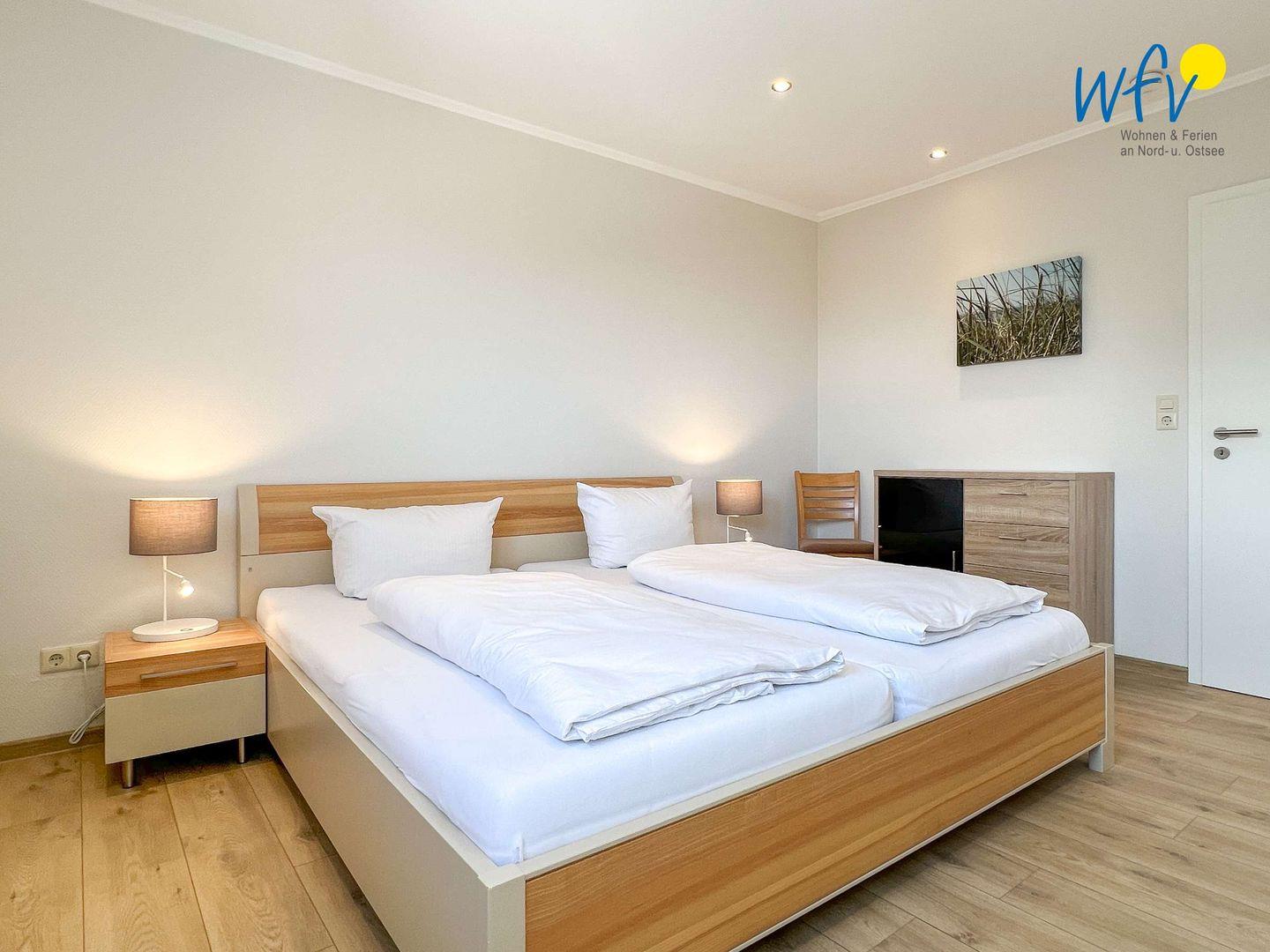 Das separate Schlafzimmer ist mit einem bequemen Komfortbett (200 cm x 200 cm) ausgestattet. Ein geräumiger Kleiderschrank bietet Platz für Ihre Urlaubsgarderobe, ein integrierter Waschbereich mit Waschtisch und Spiegel sorgt für zusätzlichen Wohnkomfort.