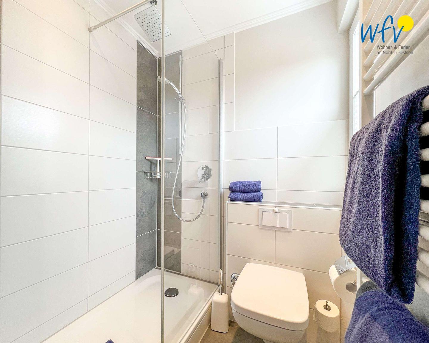 In dem kleinen modernen Tageslichtbad mit Regendusche können Sie sich nach dem Strandtag erfrischen und entspannen.