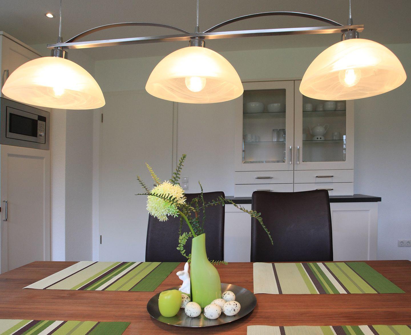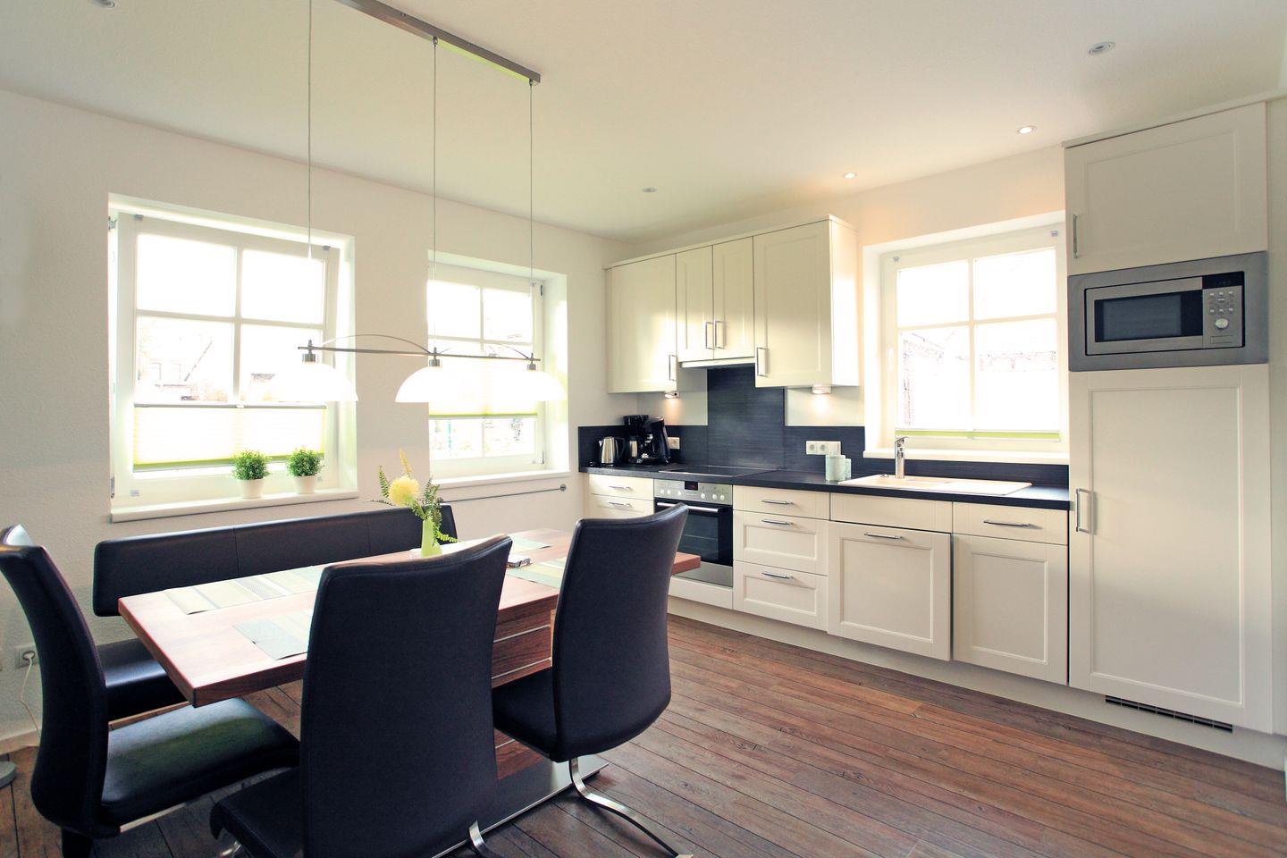 In der voll ausgestatteten Küche, die keine Wünsche offenlässt, macht gemeinsames Kochen und Essen einfach Freude. Von Cerankochfeld und Backofen über Mikrowelle und Geschirrspüler bis hin zu Kaffeemaschine, Espressomaschine und Senseo-Maschine ist alles vorhanden. Der großzügige Esstisch lädt zum gemeinsamen Essen und Beisammensein ein.