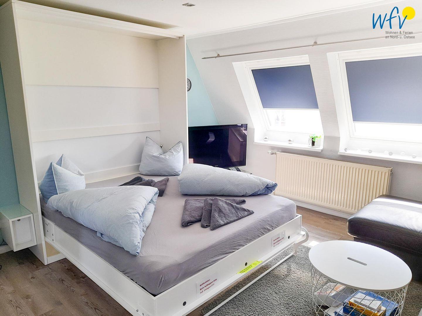 Schlafmöglichkeiten bestehen durch ein Schrankbett (160 x 200 cm) und eine Schlafcouch (140 x 200 cm) im Wohnraum. Beides können Sie schnell und einfach zu bequemen Betten umfunktionieren. Plissees verdunkeln den Raum angenehm.