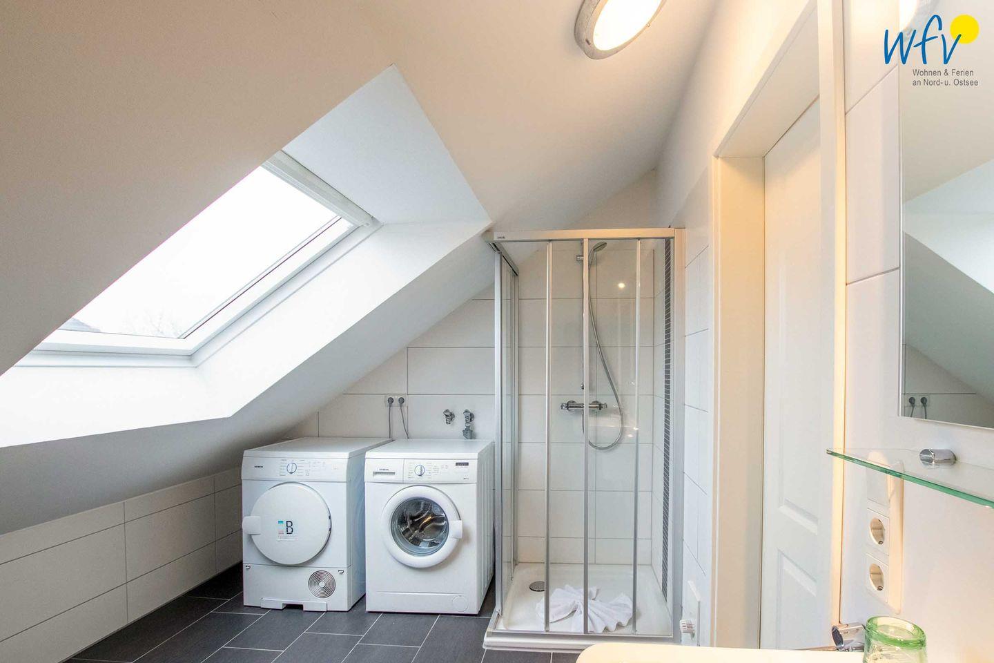 Zwei moderne Tageslichtbäder sowie ein zusätzliches Gäste-WC (EG) ermöglichen eine entspannte Nutzung bei einem Urlaub mit mehreren Personen. Das Bad im OG ist mit zwei Waschtischen, WC und Dusche ausgestattet, in dem Bad im DG befinden sich ebenfalls eine Dusche und ein WC sowie Waschmaschine und Trockner.