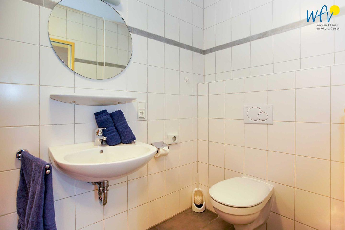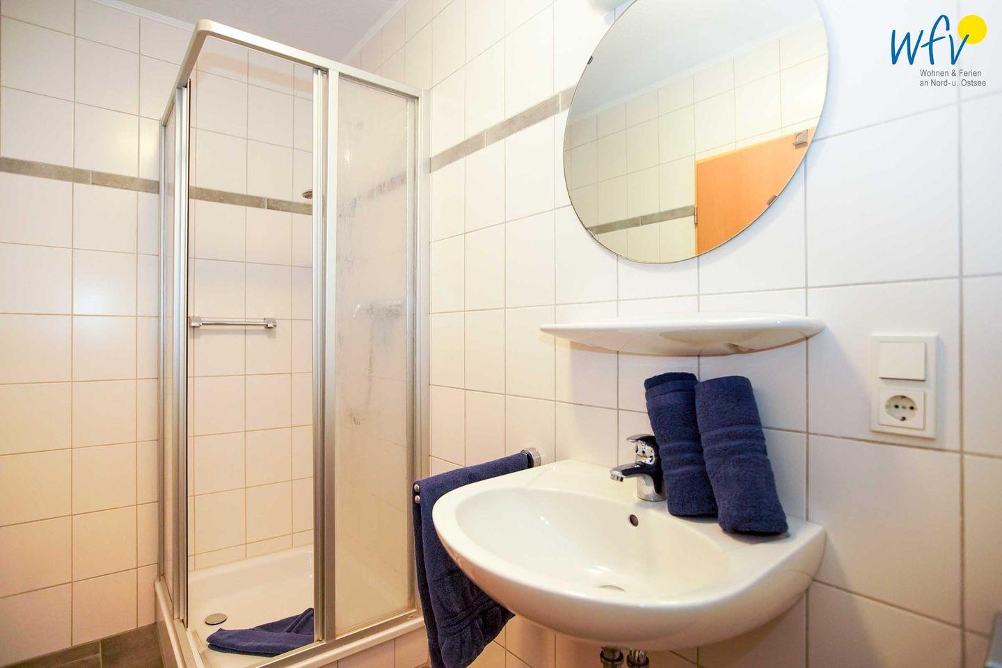 Das gepflegte Badezimmer mit Dusche, WC, Waschbecken, Haartrockner und Spiegel sorgt für weiteren Komfort.