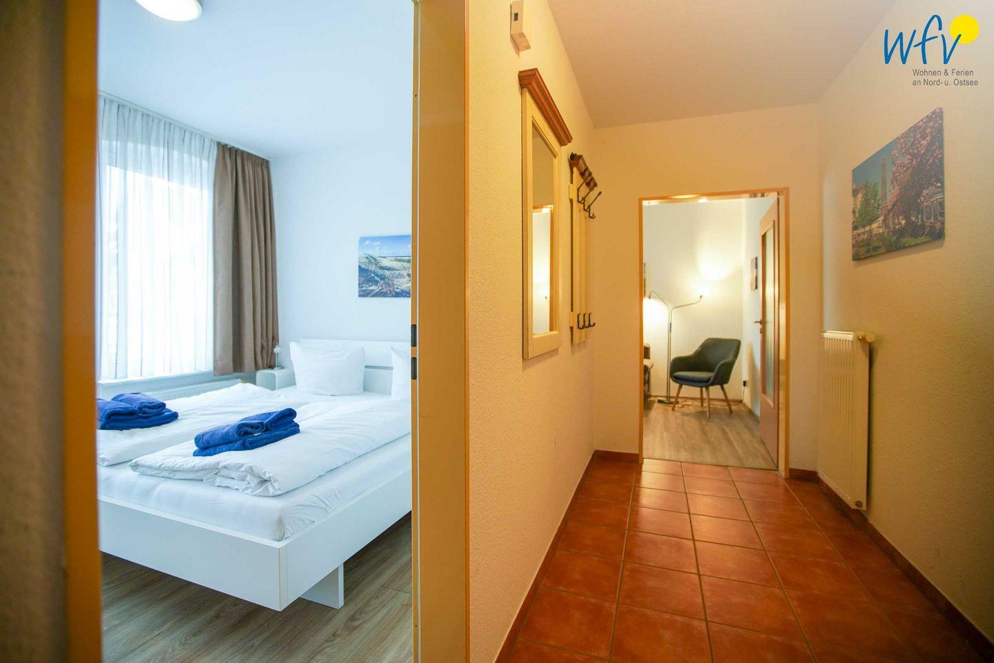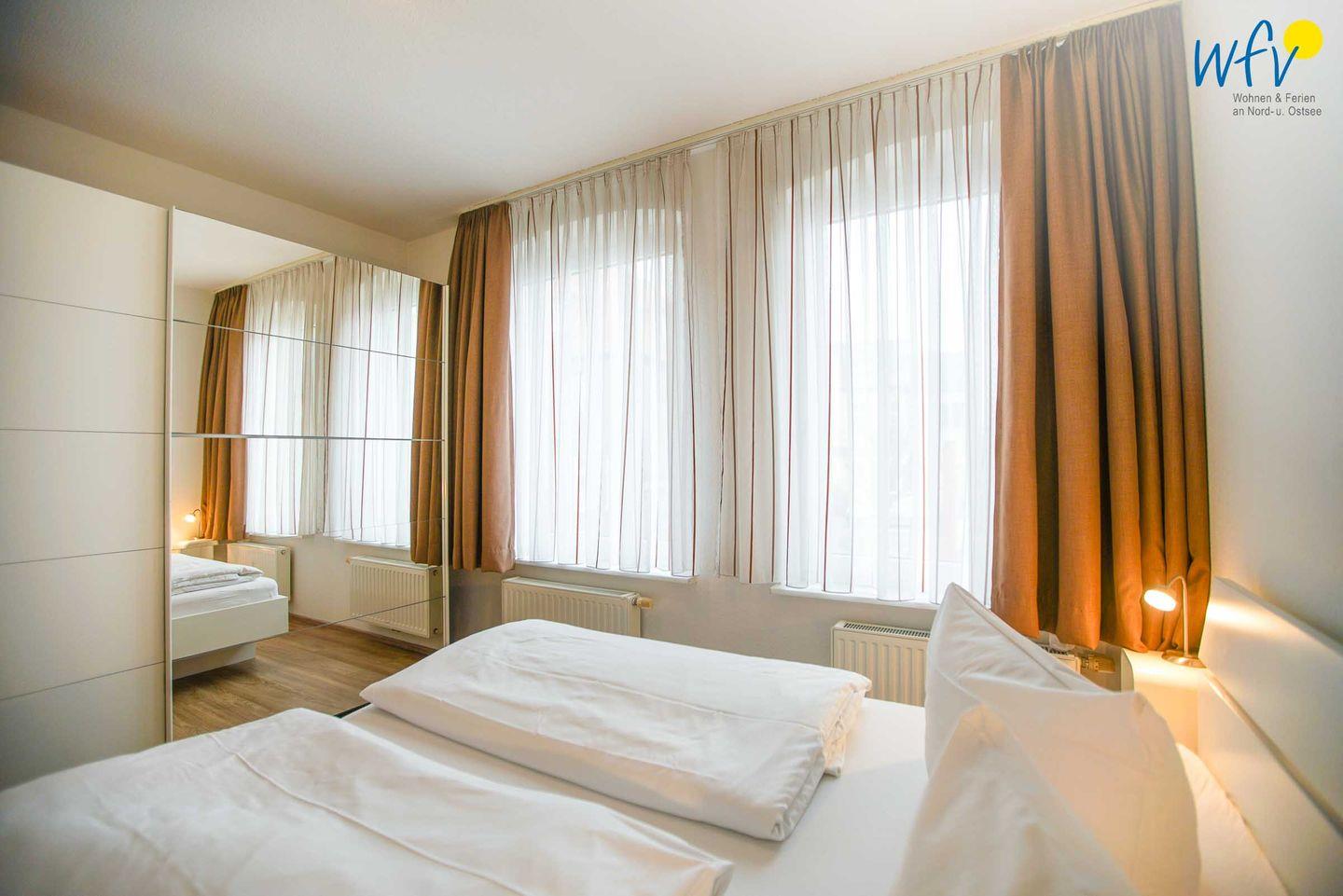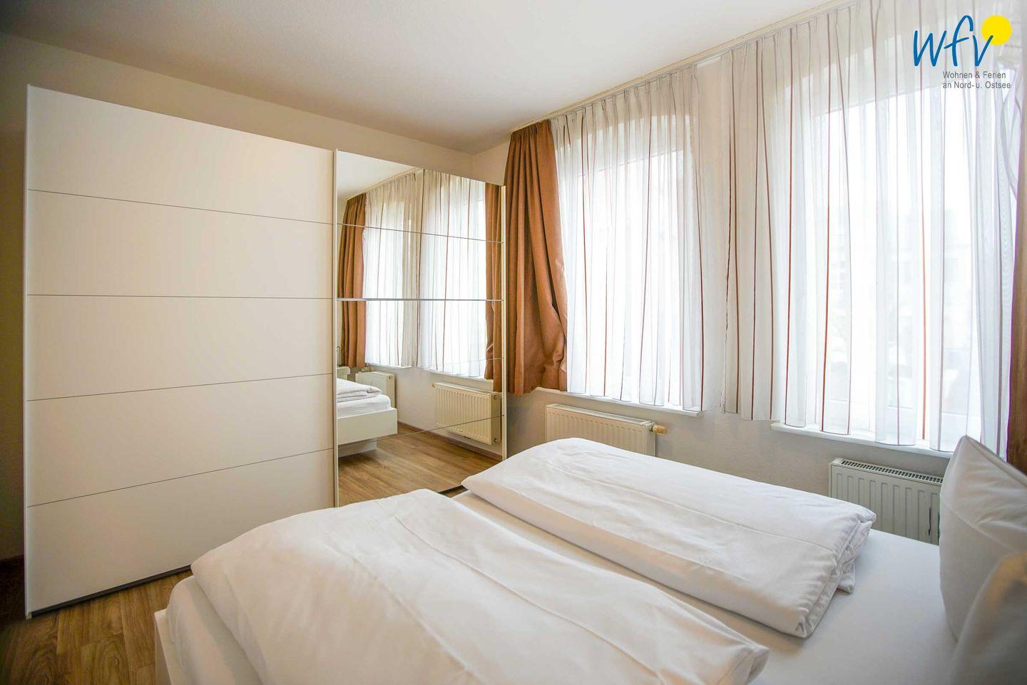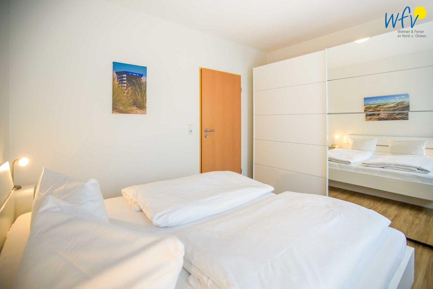 Das separate Schlafzimmer ist mit einem Doppelbett (180 x 200 cm) und einem geräumigen Kleiderschrank für Ihre Urlaubsgarderobe eingerichtet. Eine weitere Schlafmöglichkeit bietet die Schlafcouch im Wohnraum (140 x 200 cm).