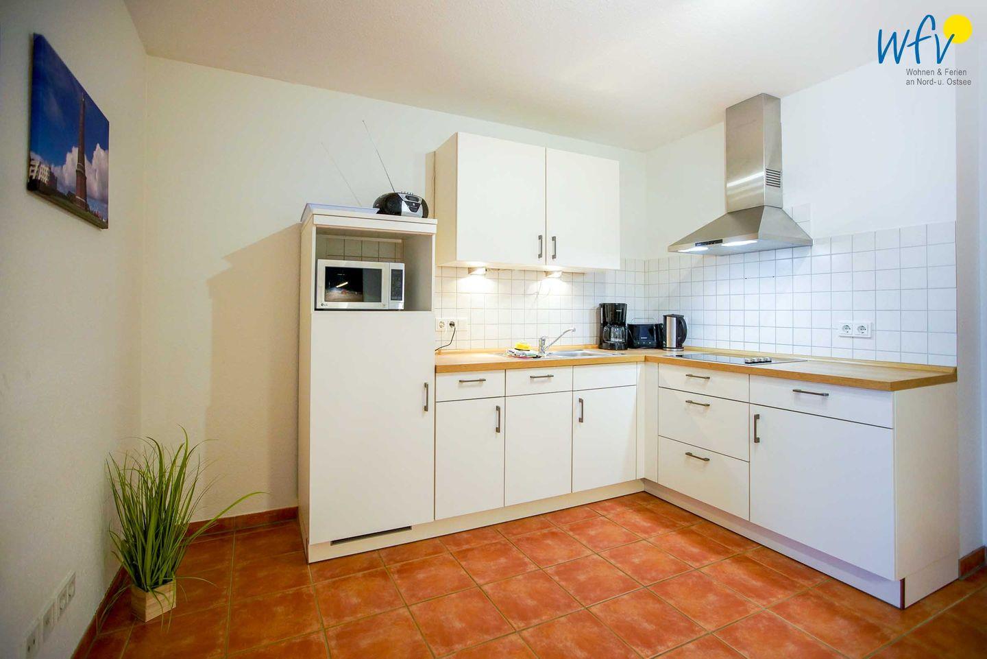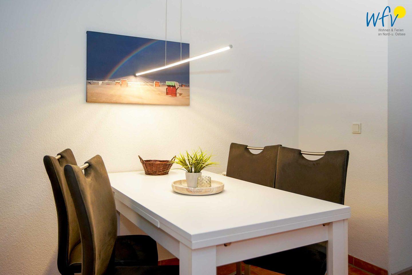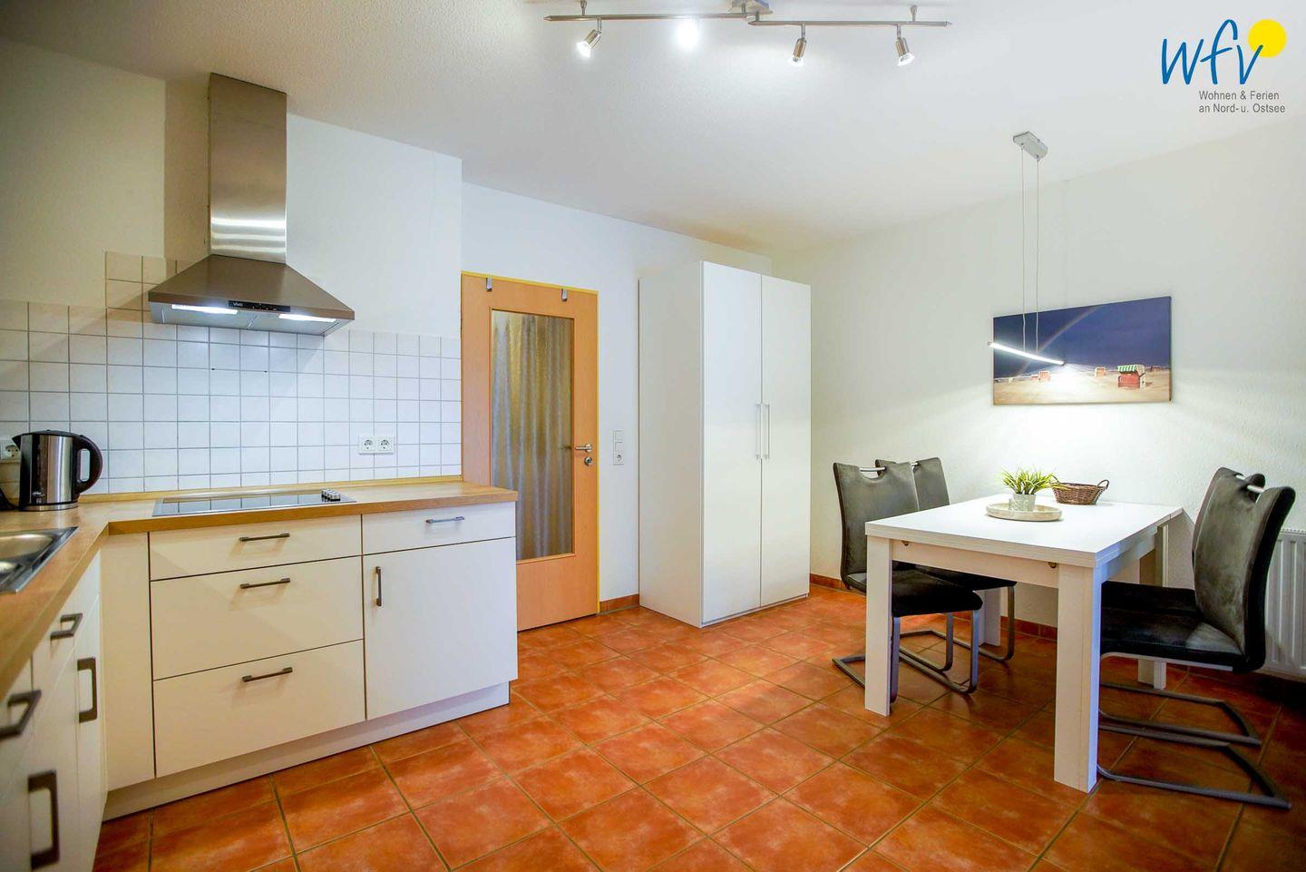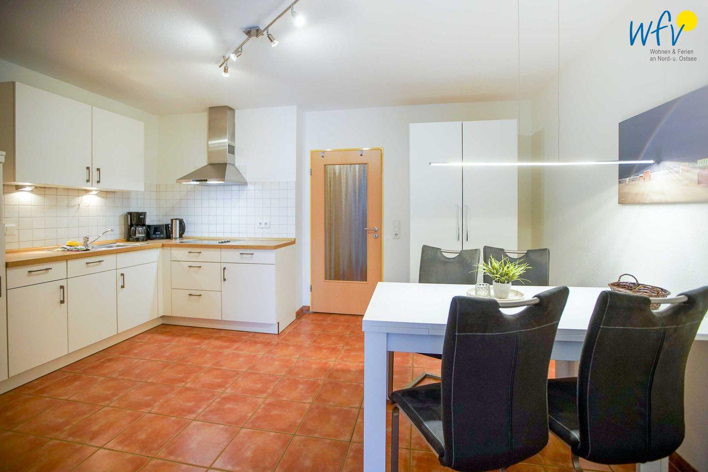 Für eine bequeme Selbstverpflegung steht Ihnen eine geschlossene vollausgestattete Küche zur Verfügung - u.a. mit Herd, Mikrowelle und Spülmaschine sowie diversen Kleingeräten. So lassen sich schnell und einfach Snacks für den Ausflug oder leckere Gerichte zubereiten. Ein Esstisch bietet Platz zum Klönen, für das Urlaubsfrühstück oder das gemeinsame Abendessen.
