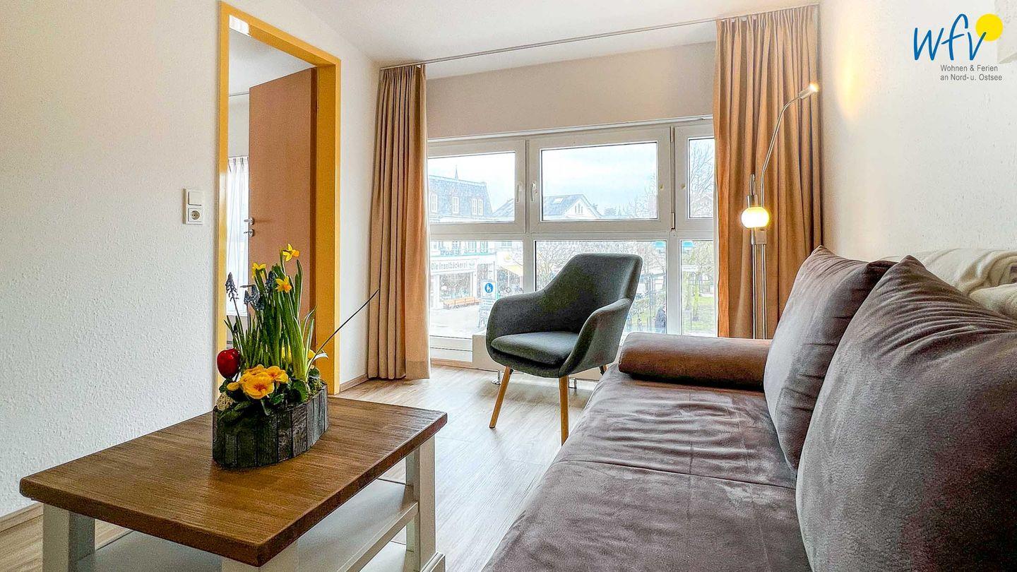 Nach dem Badetag oder der Fahrradtour können Sie im Wohnraum mit Sofa, Sesseln und TV den Urlaubstag entspannt ausklingen lassen. Zum Surfen vom Smartphone empfangen Sie freies WLAN.