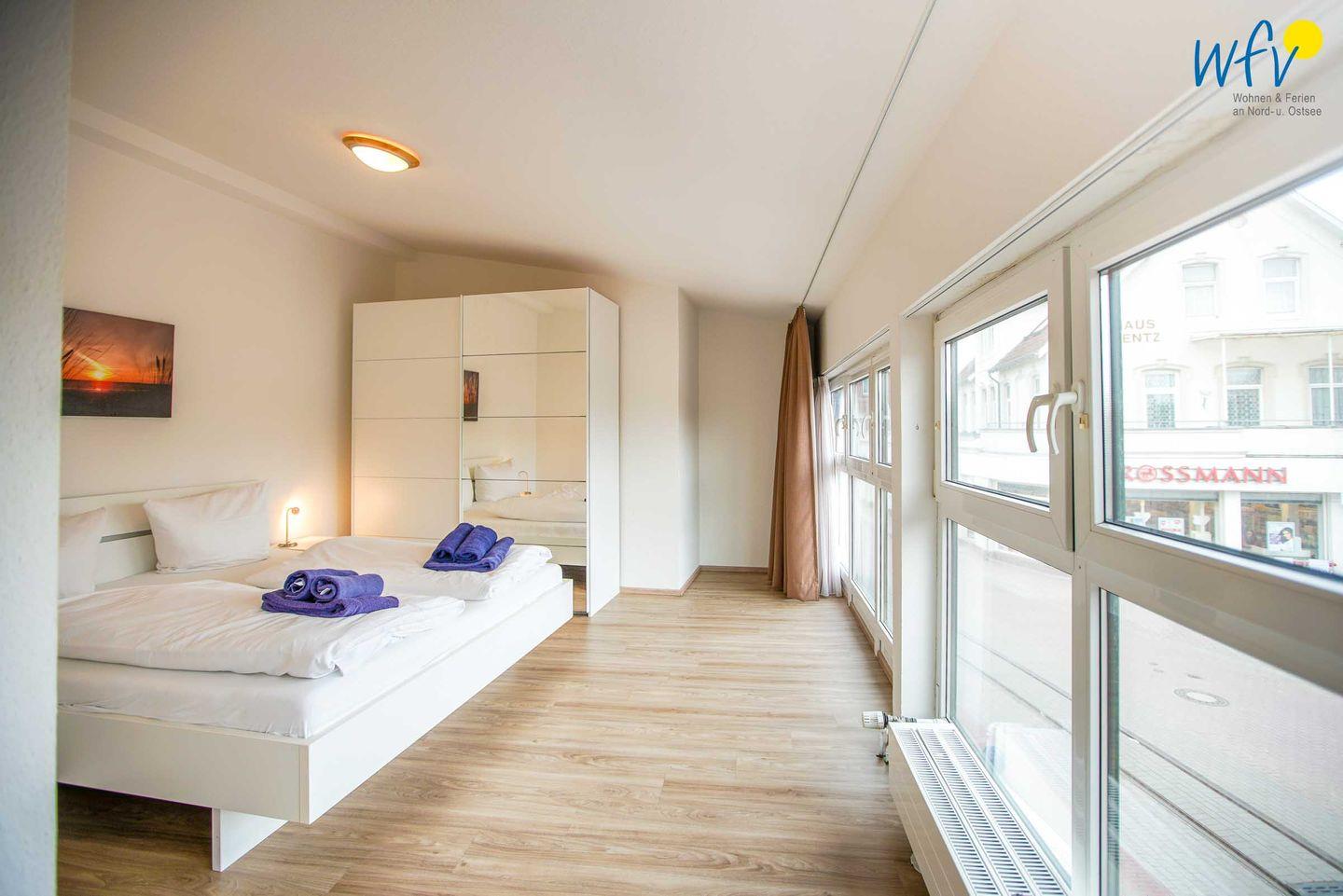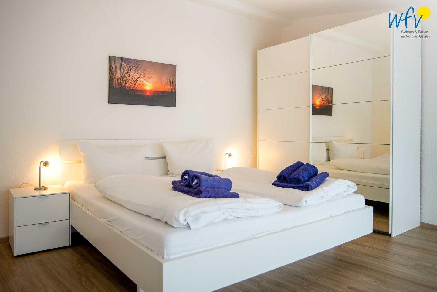 Das große separate und einladende Schlafzimmer ist mit einem Doppelbett (180 x 200 cm) und einem geräumigen Kleiderschrank für Ihre Urlaubsgarderobe eingerichtet. Eine weitere Schlafmöglichkeit bietet die Schlafcouch im Wohnraum (140 x 200 cm).
