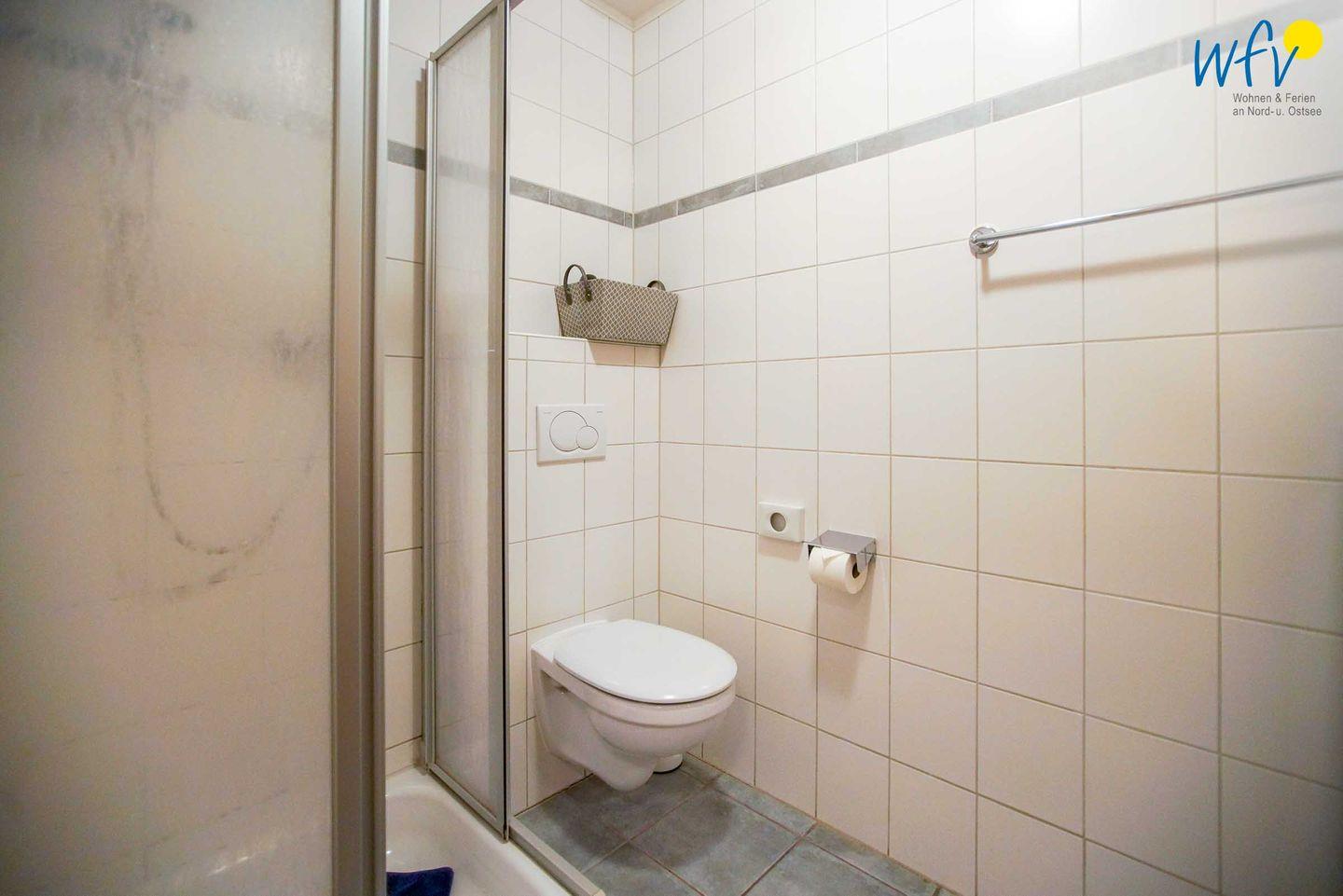 Das gepflegte Badezimmer mit Dusche, WC, Waschbecken, Haartrockner und Spiegel sorgt für weiteren Komfort.