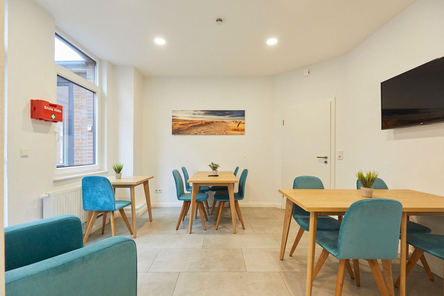 Im Erdgeschoss des Hauses steht den Gästen eine umfangreich ausgestattete Gemeinschaftsküche sowie eine Außenterrasse zur Verfügung. Hier können sich die Gäste Ihre Mahlzeiten zubereiten - dafür steht jedem Appartement ein eigener abschließbarer Kühlschrank zur exklusiven Nutzung zur Verfügung.