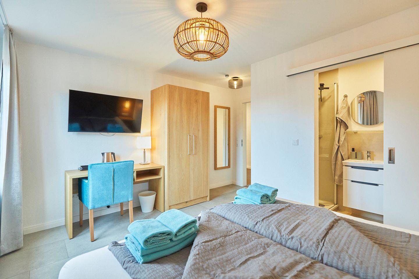 Modernes Doppelzimmer mit gemütlichem Boxspringbett und Duschbad. Eine Gemeinschaftsküche mit eigenem abschließbaren Kühlschrank für jedes Appartement sowie eine Gemeinschaftsterrasse runden den Komfort ab.