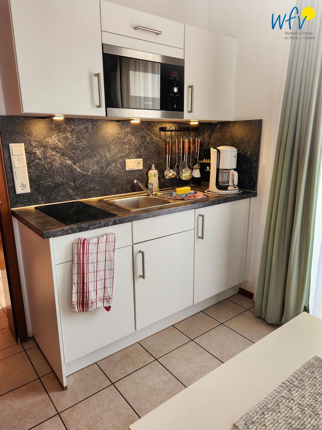 In der modernen offenen Küche lassen sich schnell und einfach Snacks für den Ausflug oder leckere Gerichte zubereiten. Ausgestattet ist sie u.a. mit einem 2-Platten-Ceranherd, Mikrowelle und Spülmaschine sowie diversen Kleingeräten.