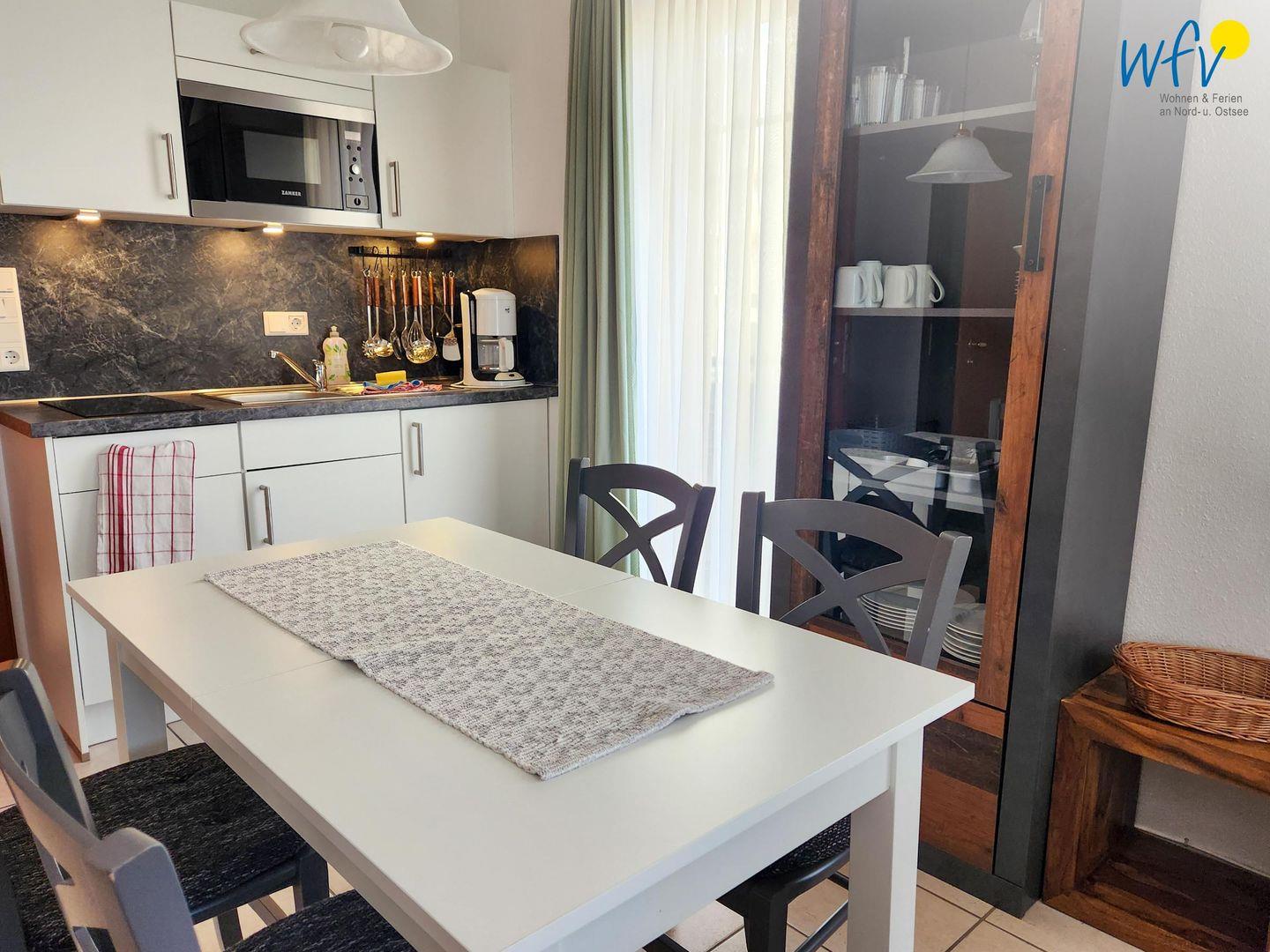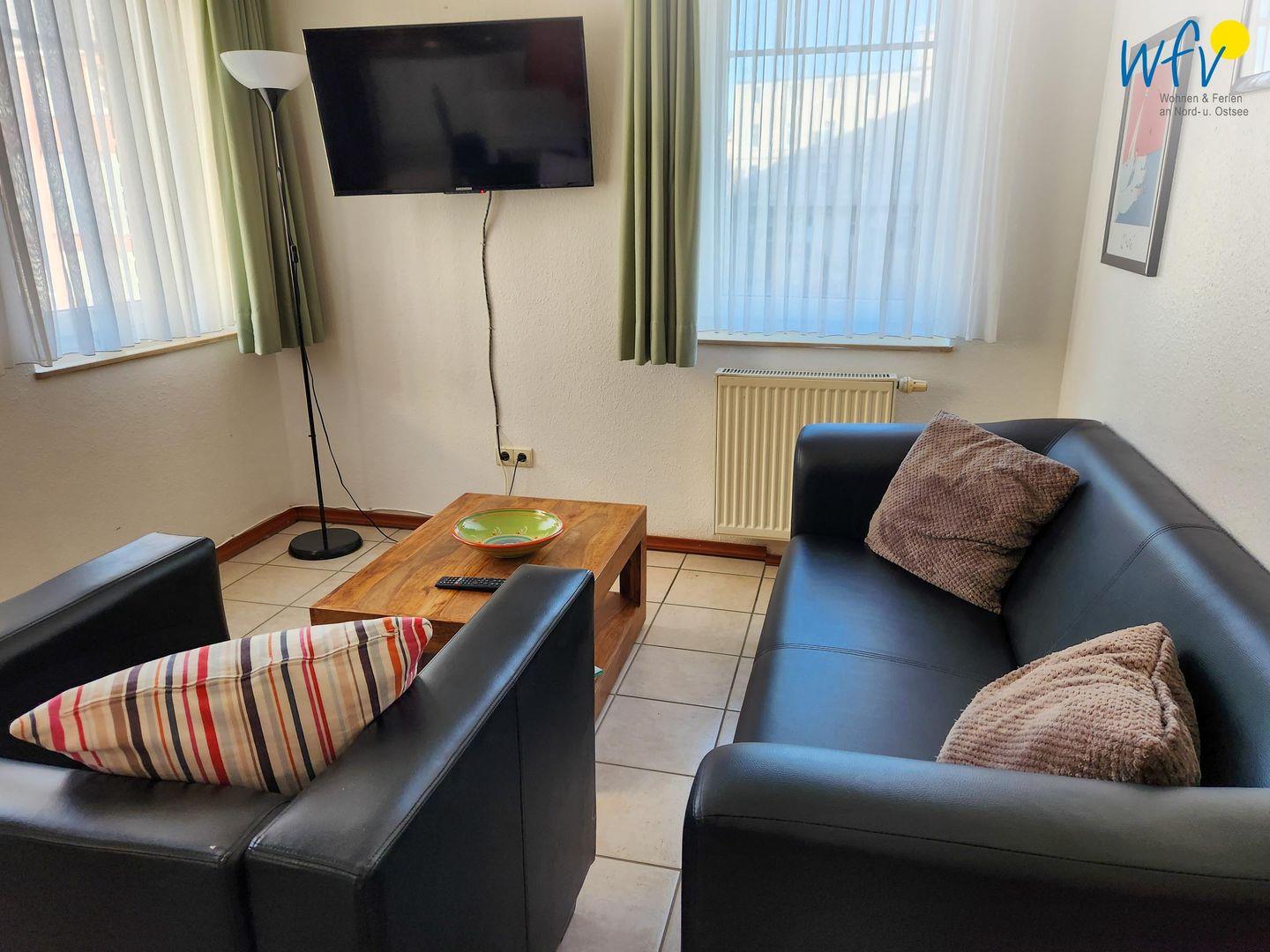 Nach dem Badetag oder der Fahrradtour lädt der Wohnraum mit Sofa, Sessel und TV zu gemütlichen Stunden ein. Zum Surfen vom Smartphone empfangen Sie freies WLAN. Ein Esstisch bietet Platz zum Klönen, für das Urlaubsfrühstück oder das gemeinsame Abendessen.