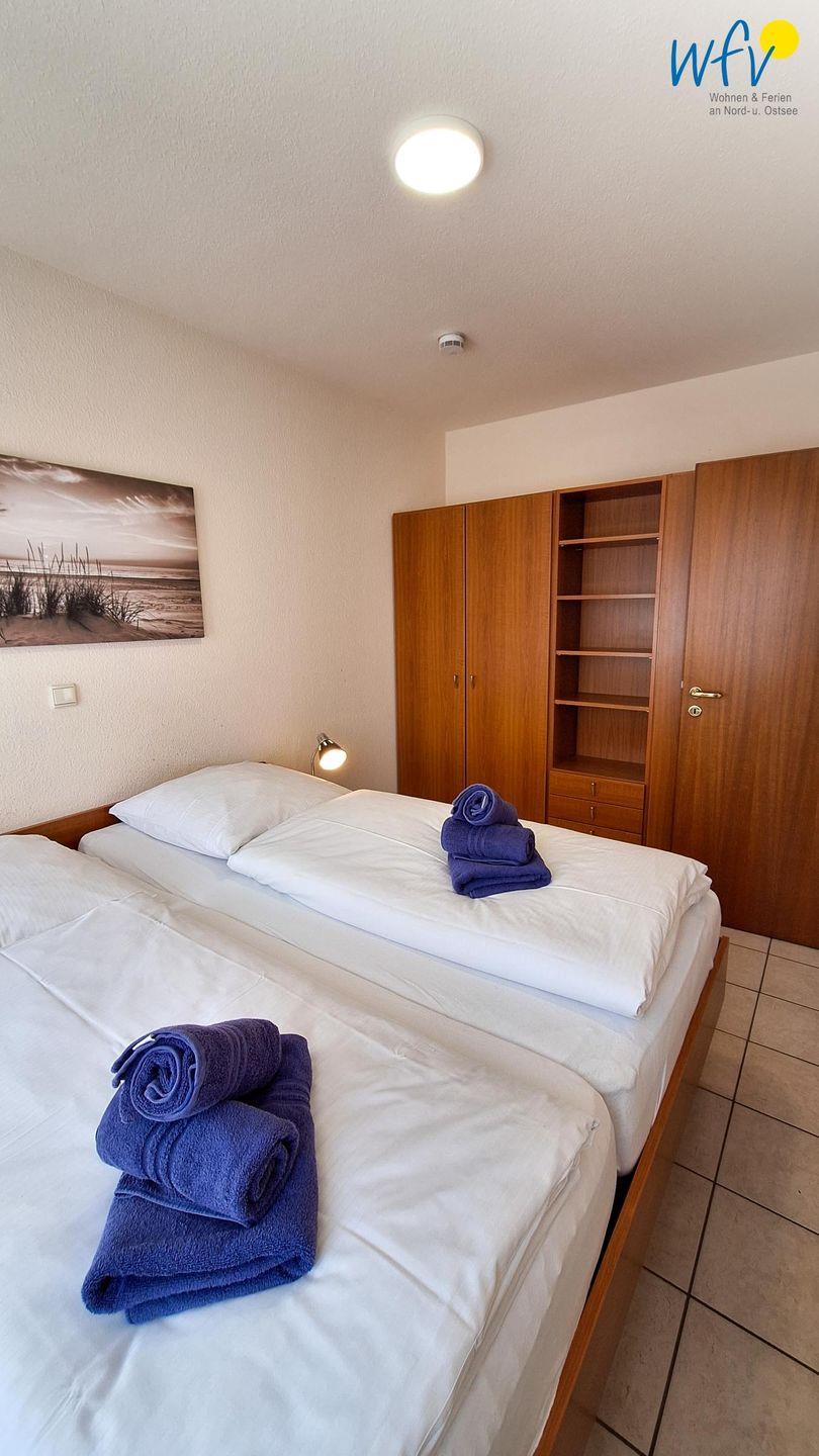 Das separate Schlafzimmer ist mit einem Doppelbett (2 x 90 x 200 cm) und einem geräumigen Kleiderschrank eingerichtet. Eine Garderobe im Flur ermöglicht eine weitere Ablage von Kleidung und Schuhen.