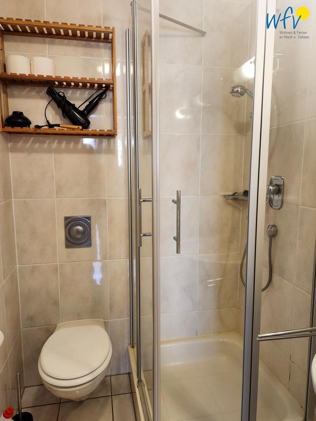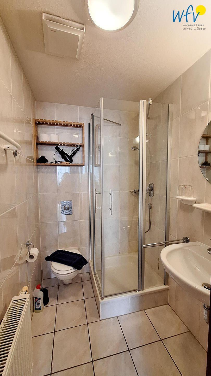 Das moderne Badezimmer mit Dusche, WC, Waschbecken mit Spiegel und Föhn ergänzt den Wohnkomfort.