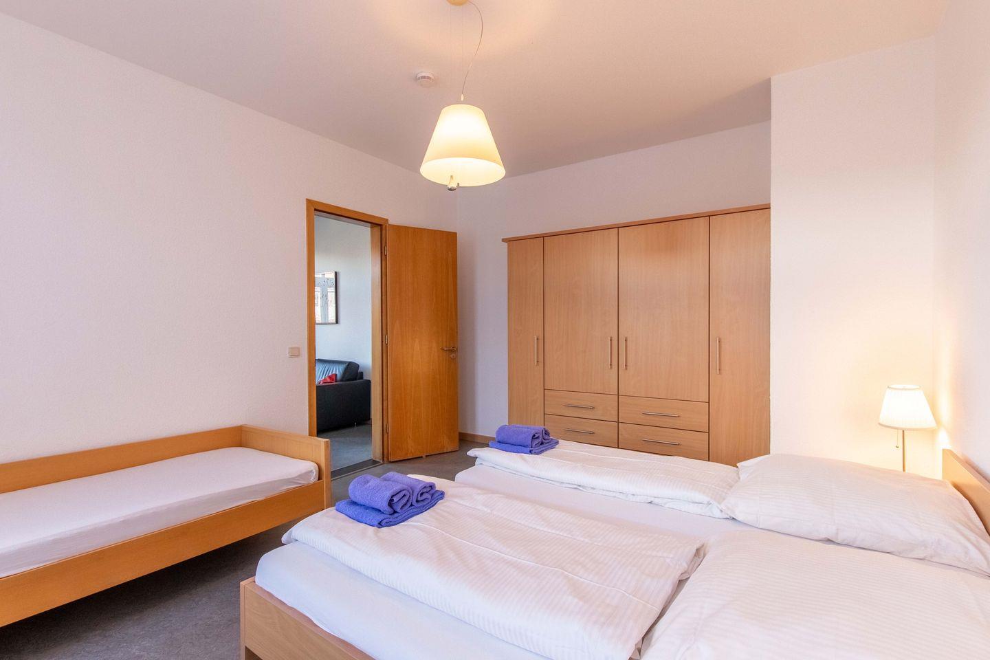 Der Wohnraum dieser Wohnung bietet eine Schlafcouch (Liegefläche 160 x 200), Es gibt eine gut ausgestattete Küche mit Spülmaschine, Herd mit Backofen und Essplatz. Ein Schlafzimmer mit Doppelbett (200 x 200) mit offenem Bettende und ein Zustellbett. Das große Pad hat eine Badewanne, Dusche und WC.