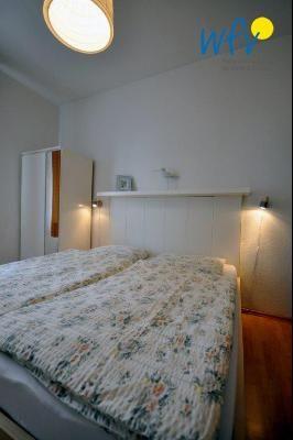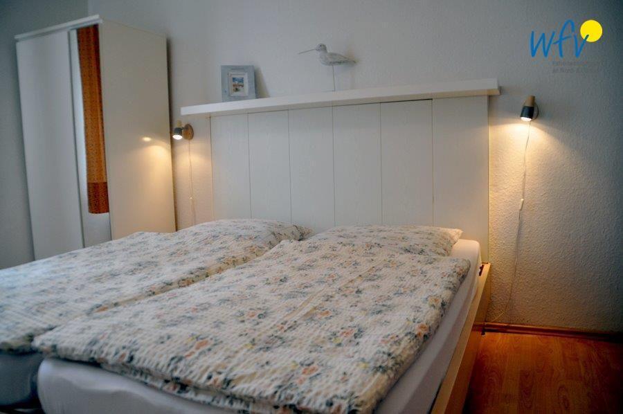 Das separate Schlafzimmer der Borkumer Ferienwohnung ist mit einem bequemen Doppelbett ausgestattet. Auf einem Schlafsofa mit Lattenrost befindet sich Platz für eine dritte Person.