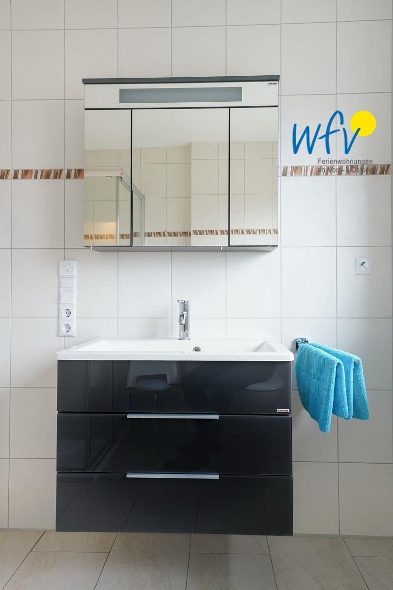 Zwei moderne Badezimmer mit Dusche, Waschbecken, Unterschrank und Infrarot-Strahler ermöglichen angenehme Ausweichmöglichkeiten.
