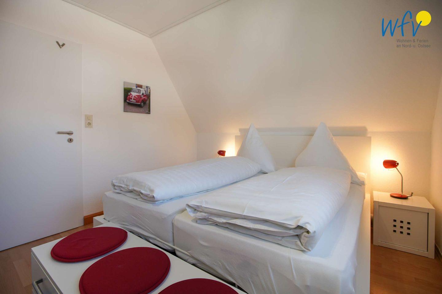 Im Obergeschoss befinden sich zwei separate Schlafräume, die mit Doppelbetten ausgestattet sind. In einem der Schlafzimmer steht zusätzlich ein Kinderbett.