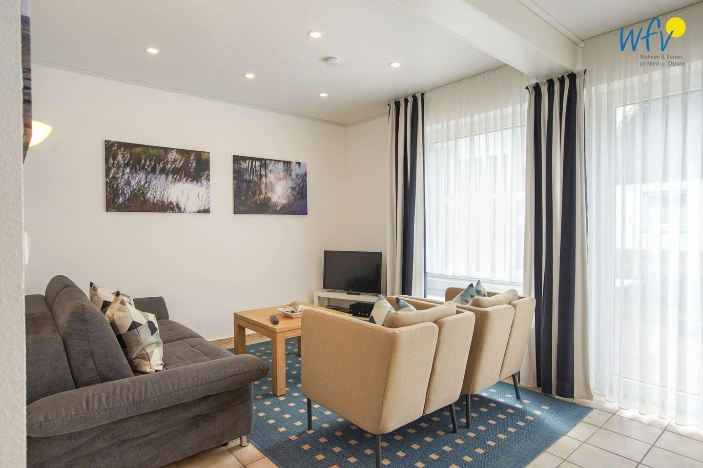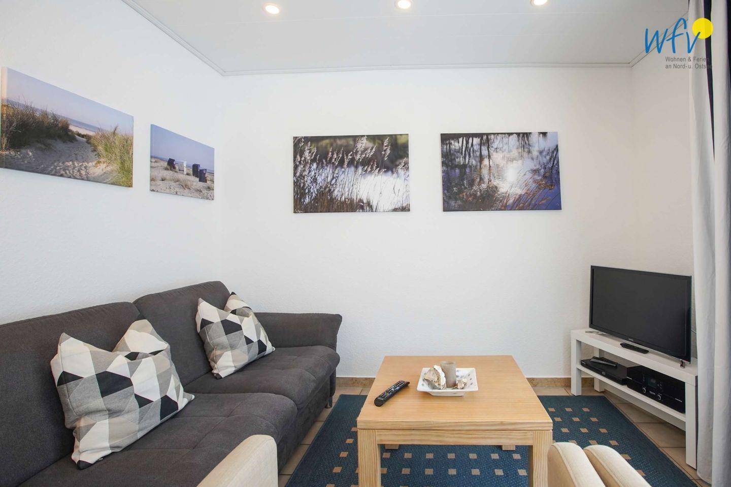 Das großzügige Wohnzimmer der Borkumer Ferienwohnung ist mit einer Couchecke gemütlich eingerichtet. Für entspannte Stunden stehen Ihnen ein SAT-TV, freies Wlan und eine Bluetooth-Box zur Verfügung.