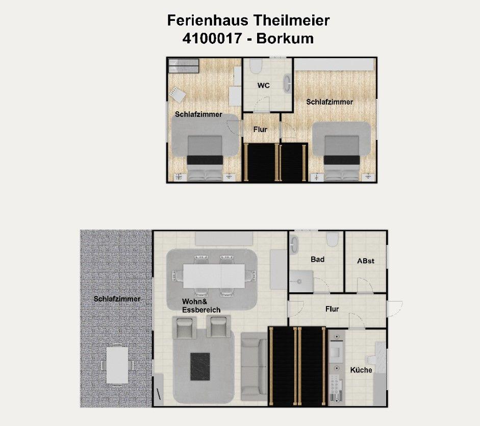 Unser "Ferienhaus Theilmeier" auf Borkum bietet Ihnen auf 75 m² Wohnfläche über 2 Etagen (Erdgeschoss und Obergeschoss) Platz für bis zu fünf Personen und einem Kleinkind.