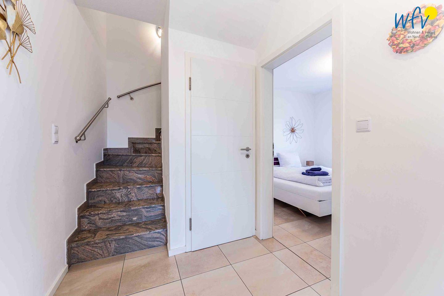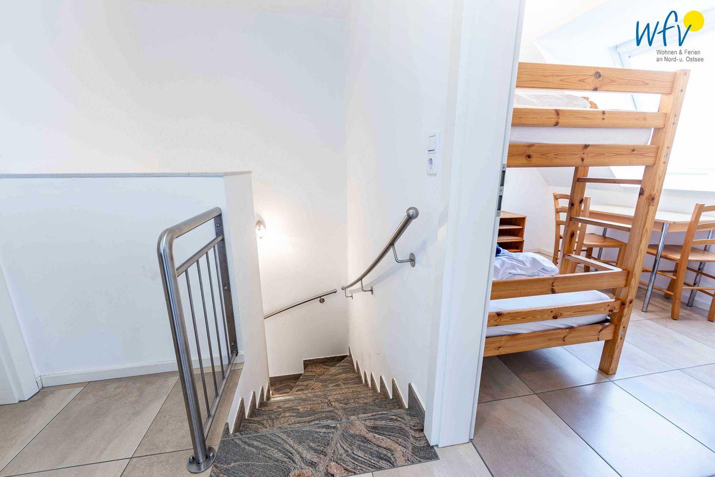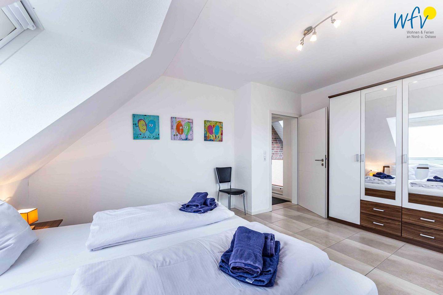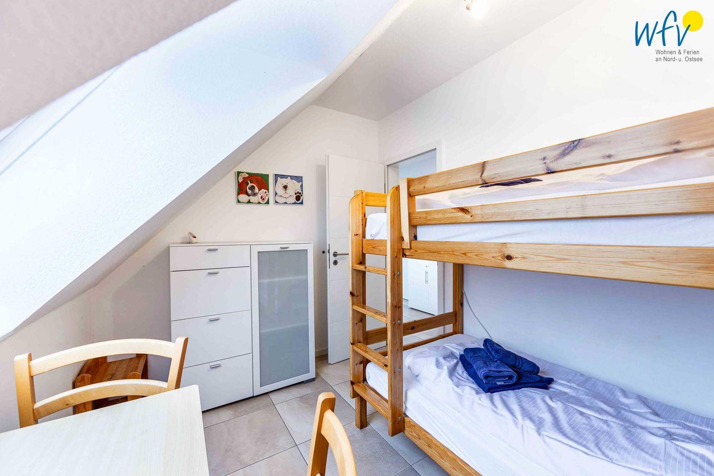 Drei der vier separaten Schlafzimmer sind in der Ferienwohnung "Muschelsucher" mit einem bequemen Doppelbett ausgestattet. Das vierte Schlafzimmer verfügt über ein Hochbett.