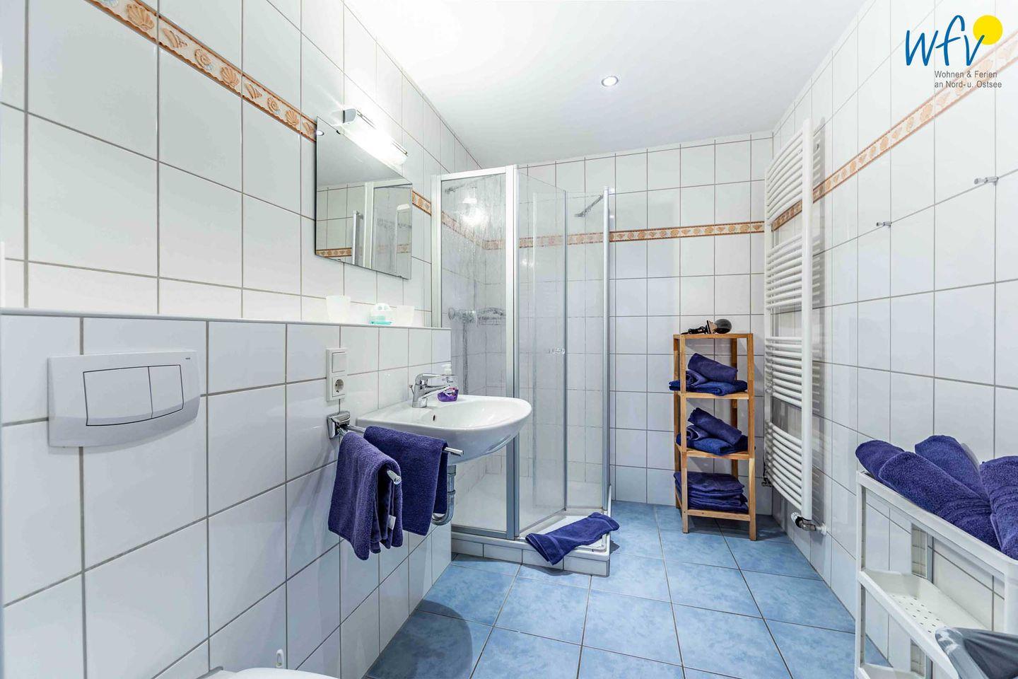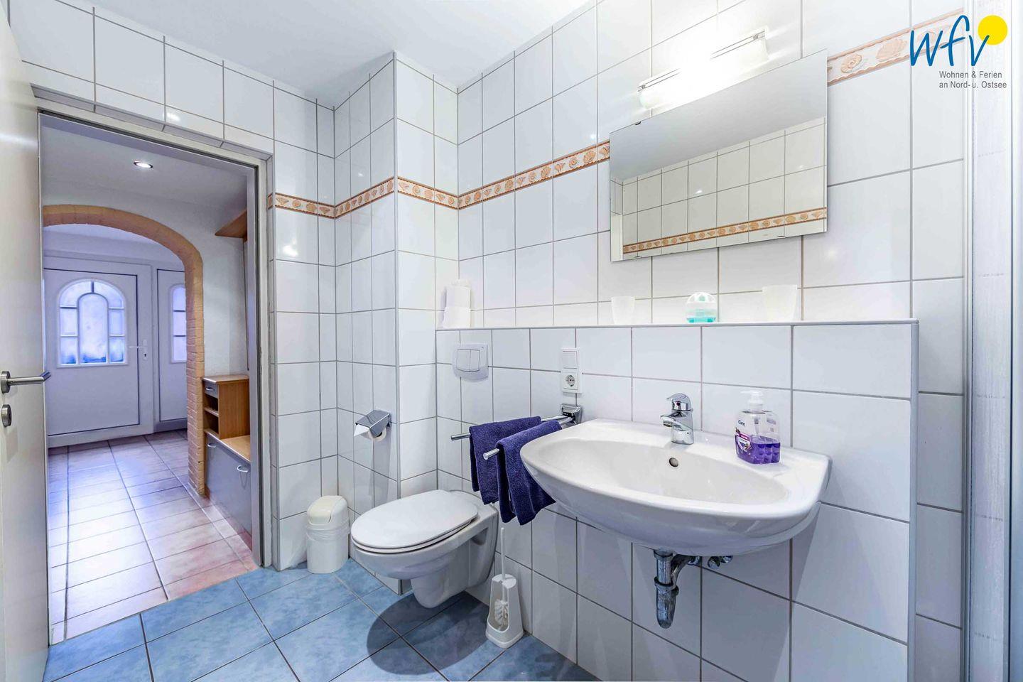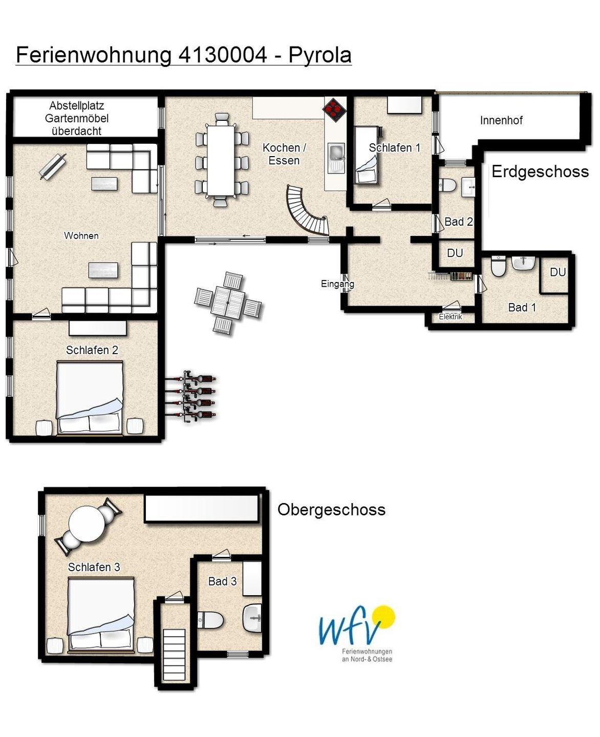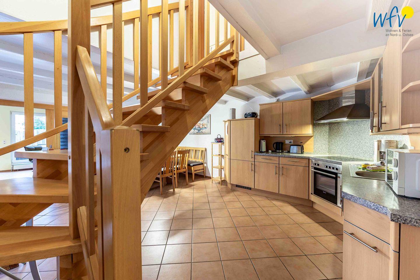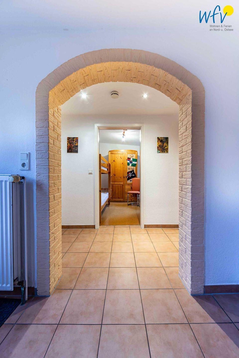 Auf zwei Etagen (EG und OG) können Sie sich mit bis zu sechs Personen wohnlich einrichten. Die Ferienwohnung verfügt über drei separate Schlafzimmer, von denen zwei mit einem Doppelbett und eines mit einem Etagenbett ausgestattet sind. Zwei Badezimmer, jeweils mit Dusche und WC, sowie eine zusätzliche Toilette ermöglichen angenehme Ausweichmöglichkeiten.