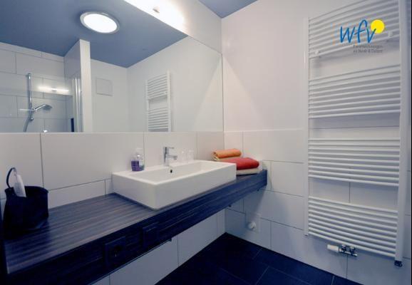Genießen Sie auch im Badezimmer der Ferienwohnung eine verwöhnende Atmosphäre: eine Fußboden- und Handtuchheizung, eine bodengleiche Dusche, ein stilvoller Designwaschtisch und ein raumbreiter Spiegel machen den Raum zu Ihrer persönlichen Entspannungsinsel.