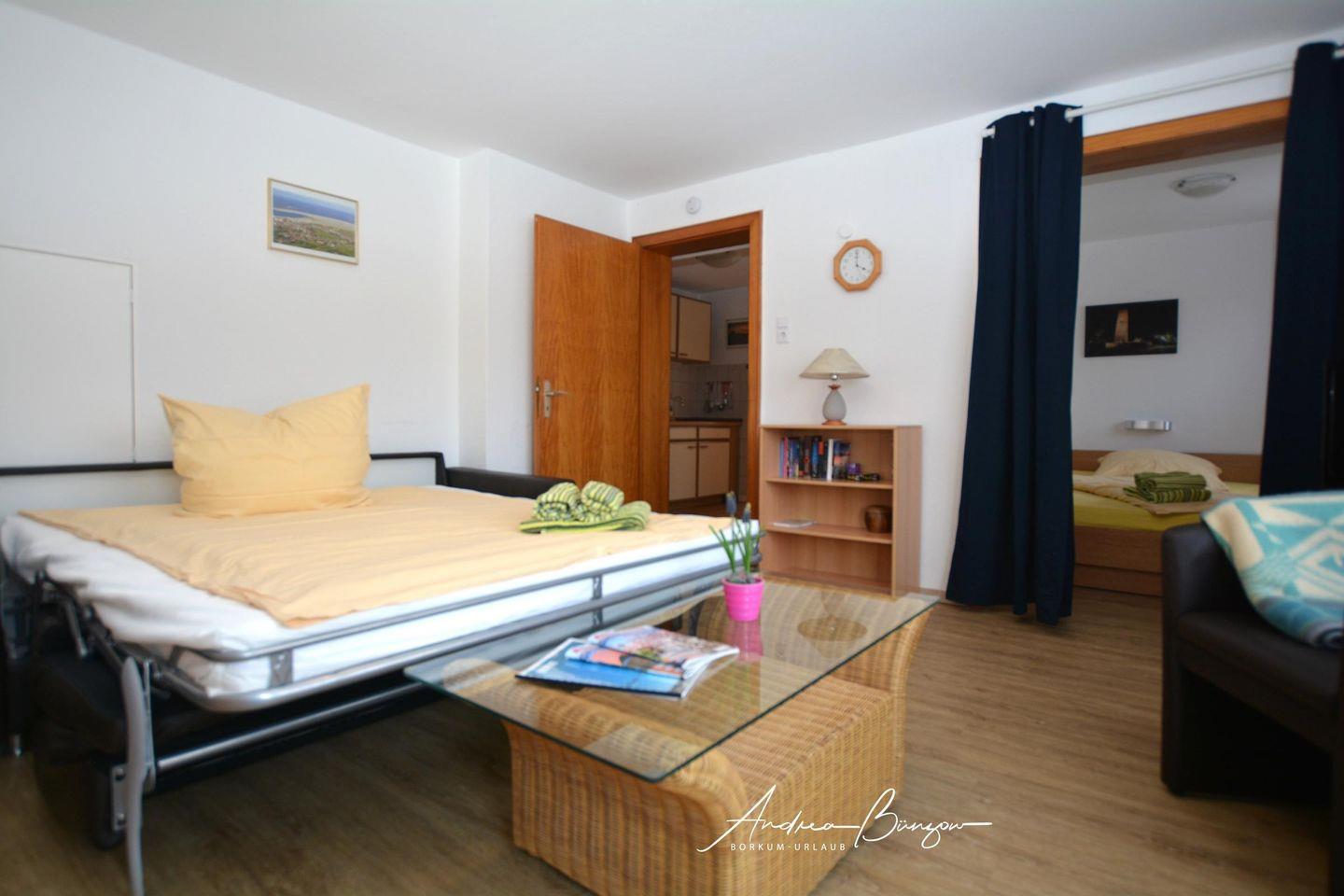 mit einem Wohnzimmer, einem Schlafraum mit franz. Doppelbett ( 140 x 200 )