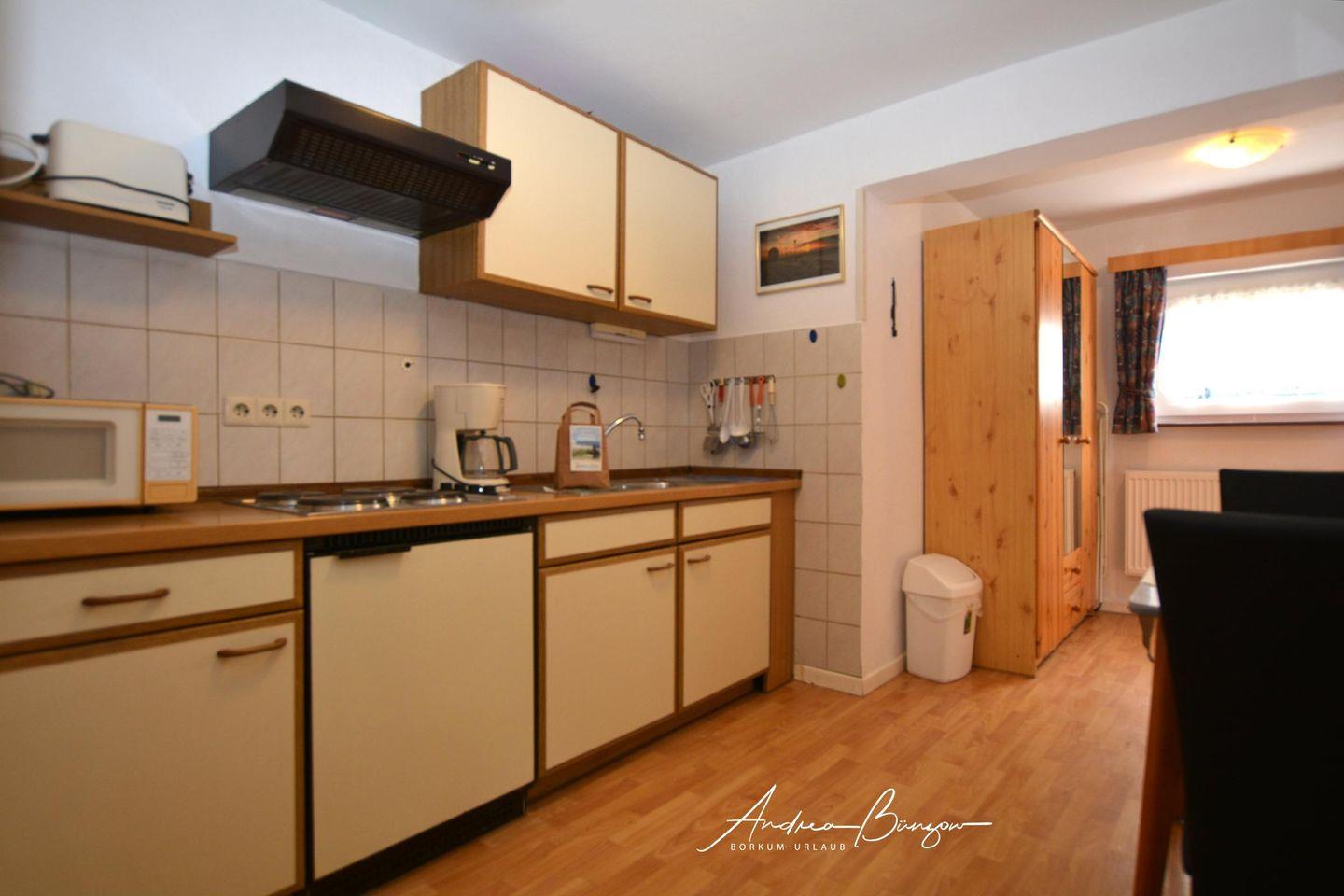 Diese geräumige Wohnung mit kleiner Terrasse (inkl. Gartenbestuhlung) hat einen gemütlichen Wohnraum mit einem kleinen separaten Schlafraum , Sat-TV mit Radio und ist optisch getrennt von der kleinen Küche mit Essplatz. Sie ist mit einem 4-Platten Herd, Kühlschrank ohne Gefrierfach, Kaffeemaschine, Toaster, Wasserkocher, Eierkocher ausgestattet und verfügt über ausreichend Kochgeschirr. Ein Tageslicht-Bad mit Dusche und WC vervollständigen das Bild. Eine Waschmaschine und Trockner sind im gemeinschaftlich nutzbaren Waschraum vorhanden.